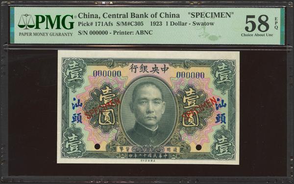 CHINA. 1 Dollar. 1923. Central Bank of China. Swatow. Specimen. (Pick: 171Afs, SM: C305). PMG58EPQ. Automatically generated translation