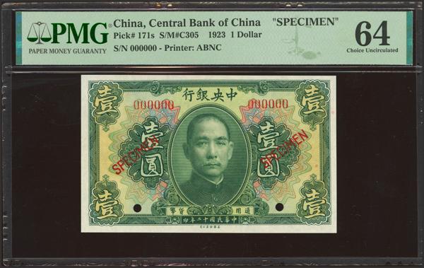 CHINA. 1 Dollar. 1923. Central Bank of China. Specimen. (Pick: 171s, SM: C305). PMG64. Automatically generated translation