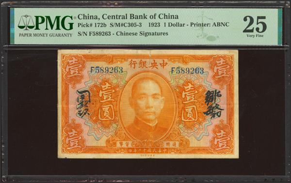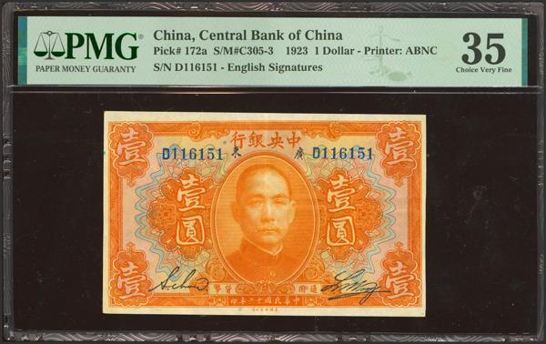 CHINA. 1 Dollar. 1923. Central Bank of China. (Pick: 172a SM: C305-3). PMG35 (according to the PMG population report, it is the Top Pop banknote as of 15 February 2025). Automatically generated translation