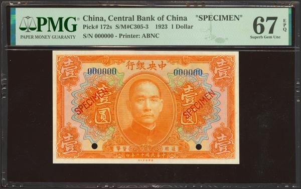 CHINA. 1 Dollar. 1923. Central Bank of China. Specimen. (Pick: 172s, SM: C305-3). PMG67EPQ (according to the PMG population report, it is the Top Pop banknote as of 15 February 2025). Automatically generated translation