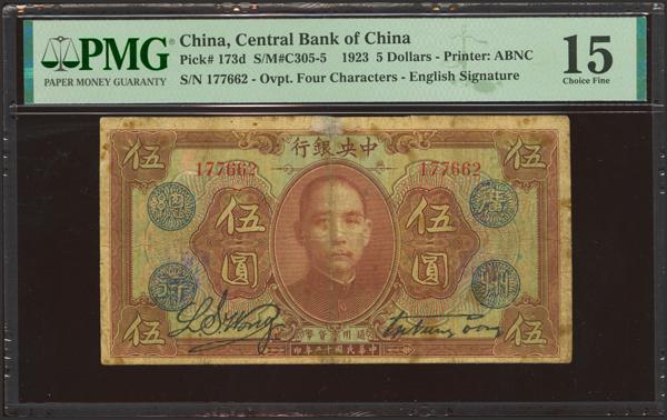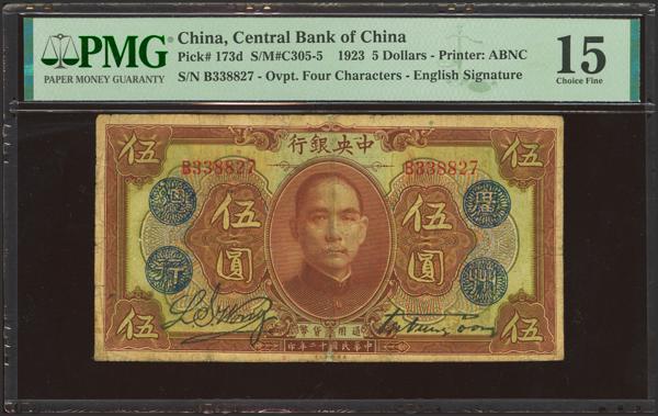 CHINA. 5 Dollars. 1923. Central Bank of China. (Pick: 173d, SM: 305-5). PMG15 (tape repair, ink stamp). Automatically generated translation