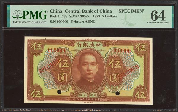 CHINA. 5 Dollars. 1923. Central Bank of China. Specimen. (Pick: 173s, SM: C305-5). PMG64. Automatically generated translation