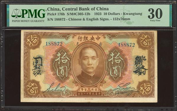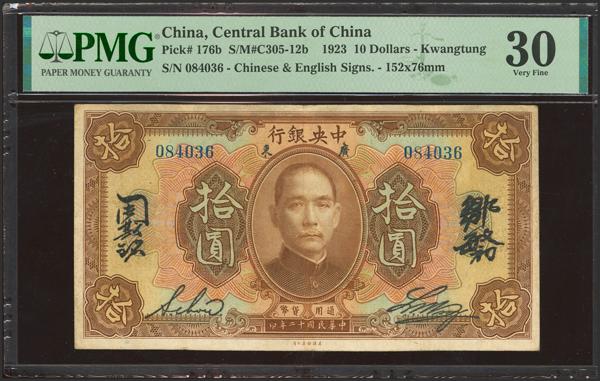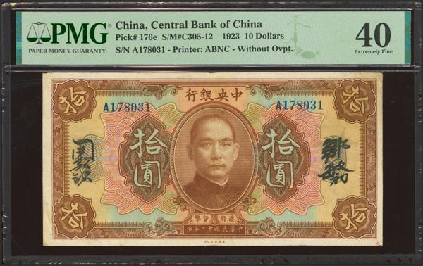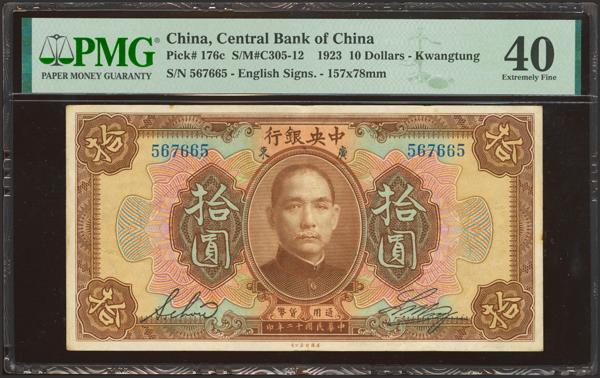 CHINA. 10 Dollars. 1923. Central Bank of China. (Pick: 176a, SM: C305-12). PMG40 Automatically generated translation