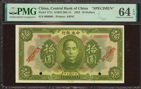 CHINA. 10 Dollars. 1923. Central Bank of China. Specimen. (Pick: 177s, SM: C305-14). PMG64EPQ. Automatically generated translation
