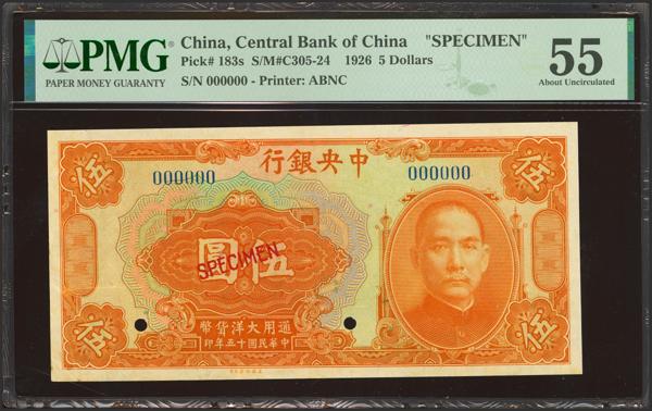 CHINA. 5 Standard Dollars. 1926. Central Bank of China. Specimen. (Pick: 183s, SM: C305-24). PMG55. Automatically generated translation