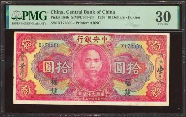 CHINA. 10 Standard Dollars. 1926. Central Bank of China. Fukien. (Pick: 184b, SM: C305-26). PMG30 (minor discoloration). Automatically generated translation
