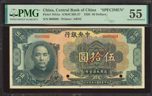 CHINA. 50 Standard Dollars. 1926. Central Bank of China. Specimen. (Pick: 184As, SM: C305-27). PMG55. Automatically generated translation