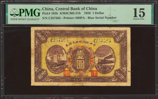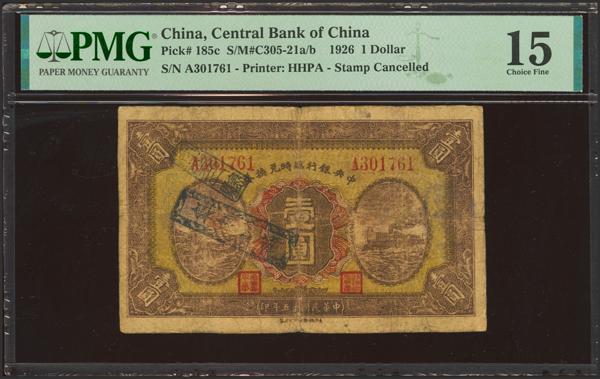 CHINA. 1 Yuan. 1926. Central Bank of China. (Pick: 185c, SM: C305-21a/b). PMG15 (ink stamps). Automatically generated translation