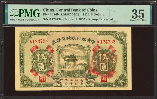 CHINA. 5 Dollars. 1926. Central Bank of China. (Pick: 186b, SM: C305-23). PMG35. Automatically generated translation