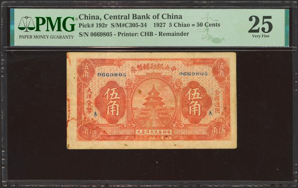 CHINA. 50 Cents. 1927. Central Bank of China. Remainder. (Pick: 192r). PMG25. Automatically generated translation