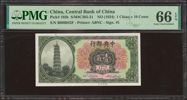 CHINA. 10 Cents. (1924ca). Central Bank of China. (Pick: 193b., SM: C305-31). PMG66EPQ. Automatically generated translation