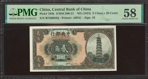 CHINA. 20 Cents. (1924ca). Central Bank of China. (Pick: 194b, SM: C300-21). PMG58. Automatically generated translation