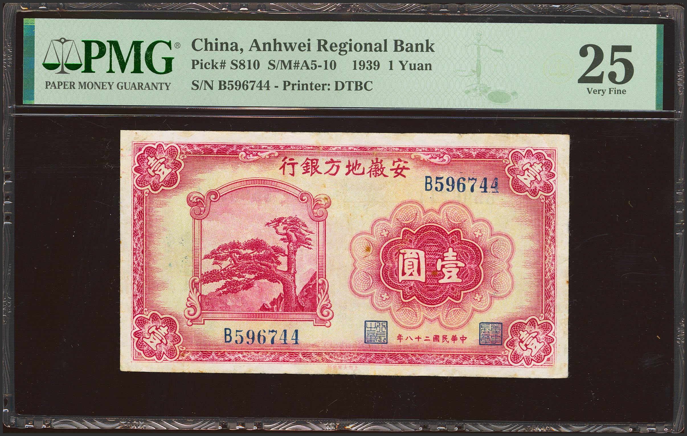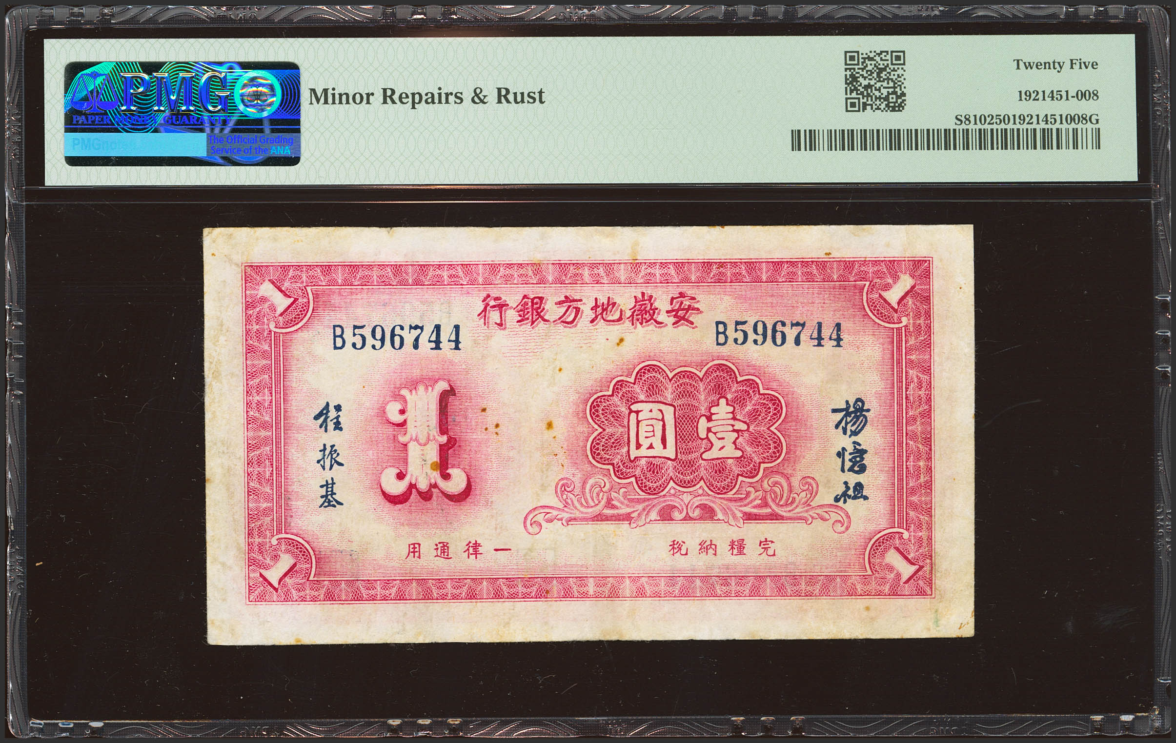 CHINA. 1 Yuan. (1937ca). Anhwai Regional Bank. (Pick: S810, SM: A5-10). Minor repairs. PMG25 (minor repairs, rust).