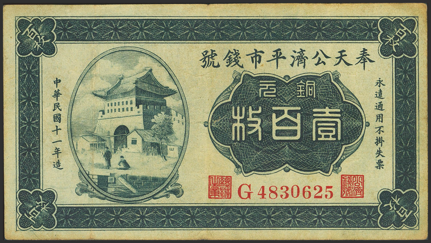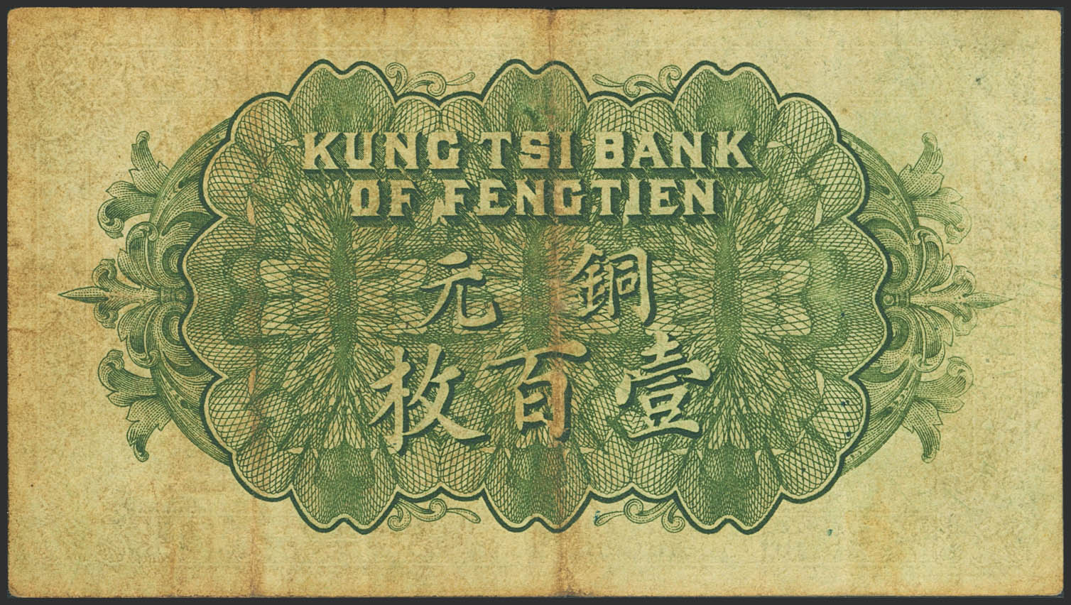 CHINA. 100 Coppers. 1922. Kung Tsi Bank of Fengtien. Engraved. (Pick: S1364). Very Fine.