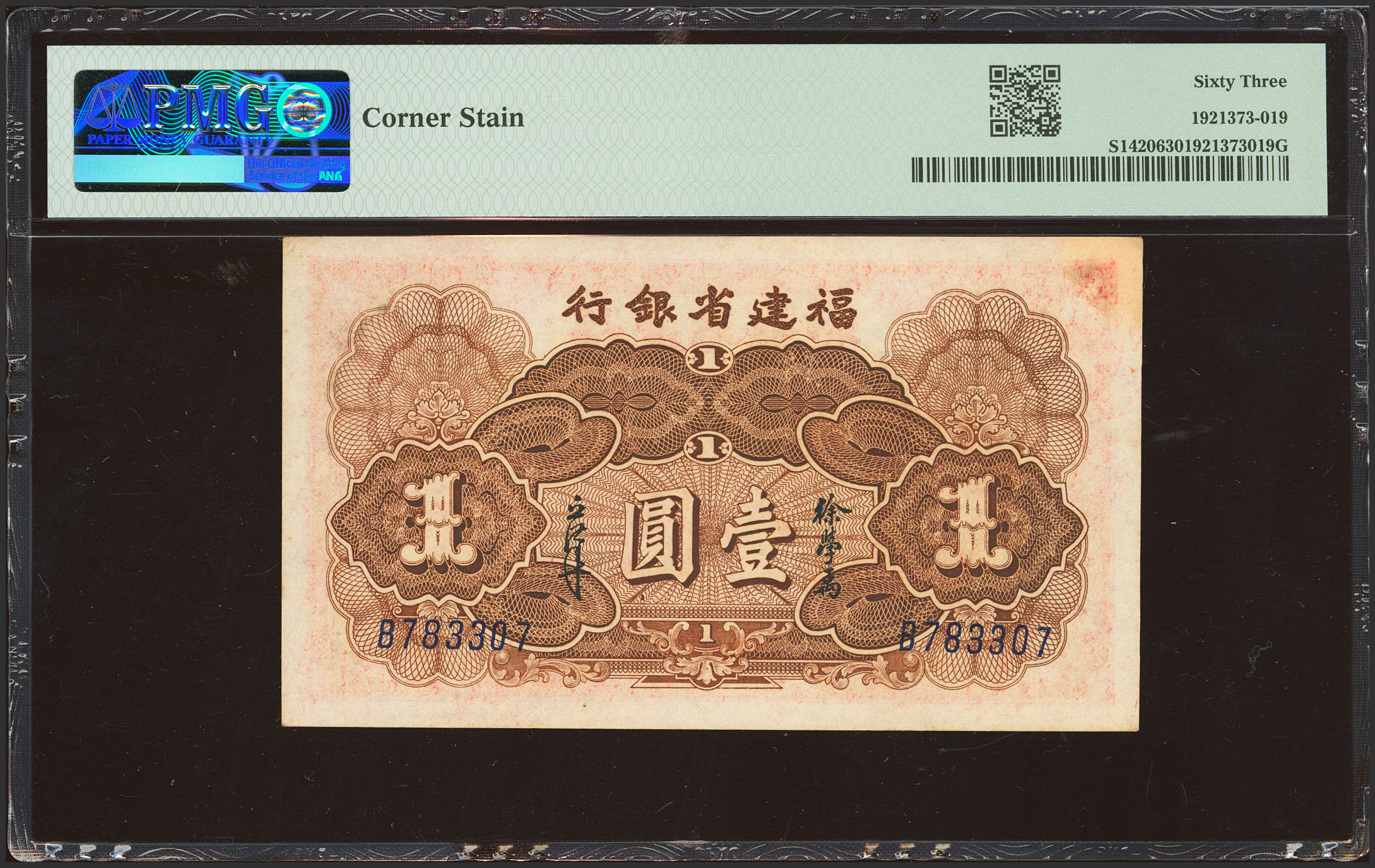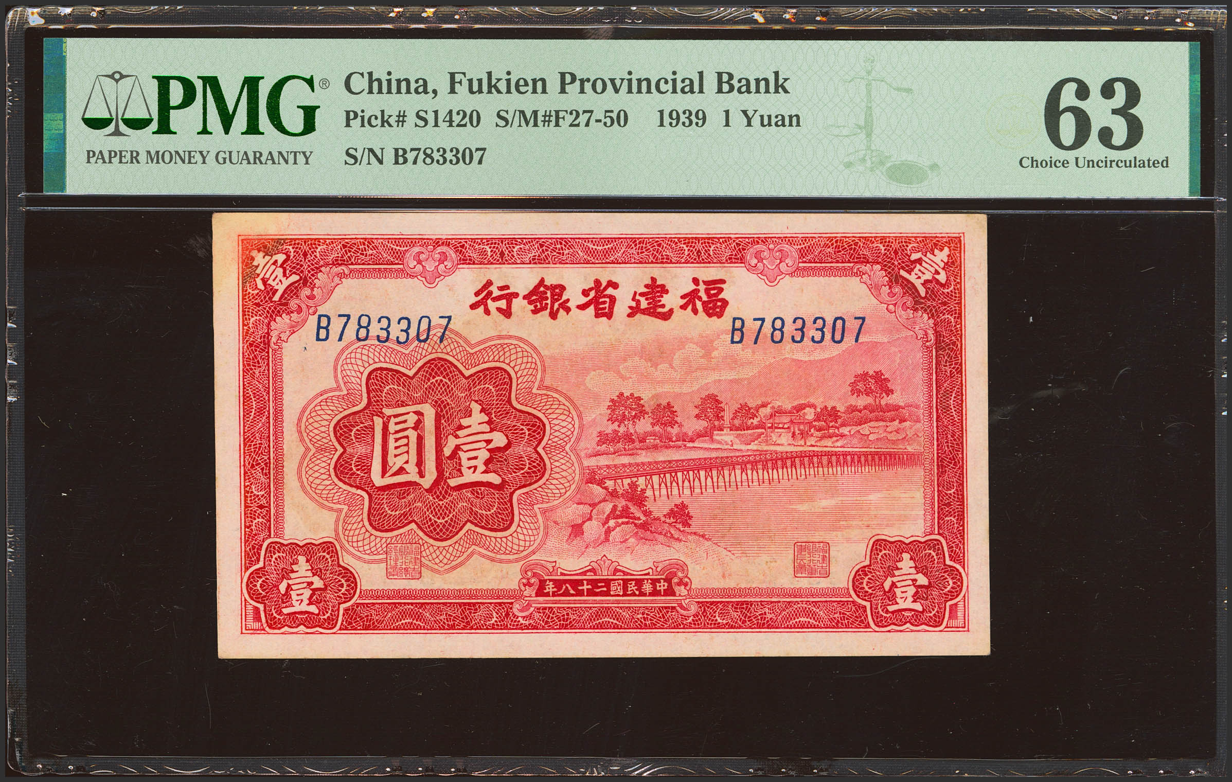 CHINA. 1 Yuan. 1939. Fukien Provincial Bank. (Pick: S1420, SM: F27-50). PMG63 (corner stain).