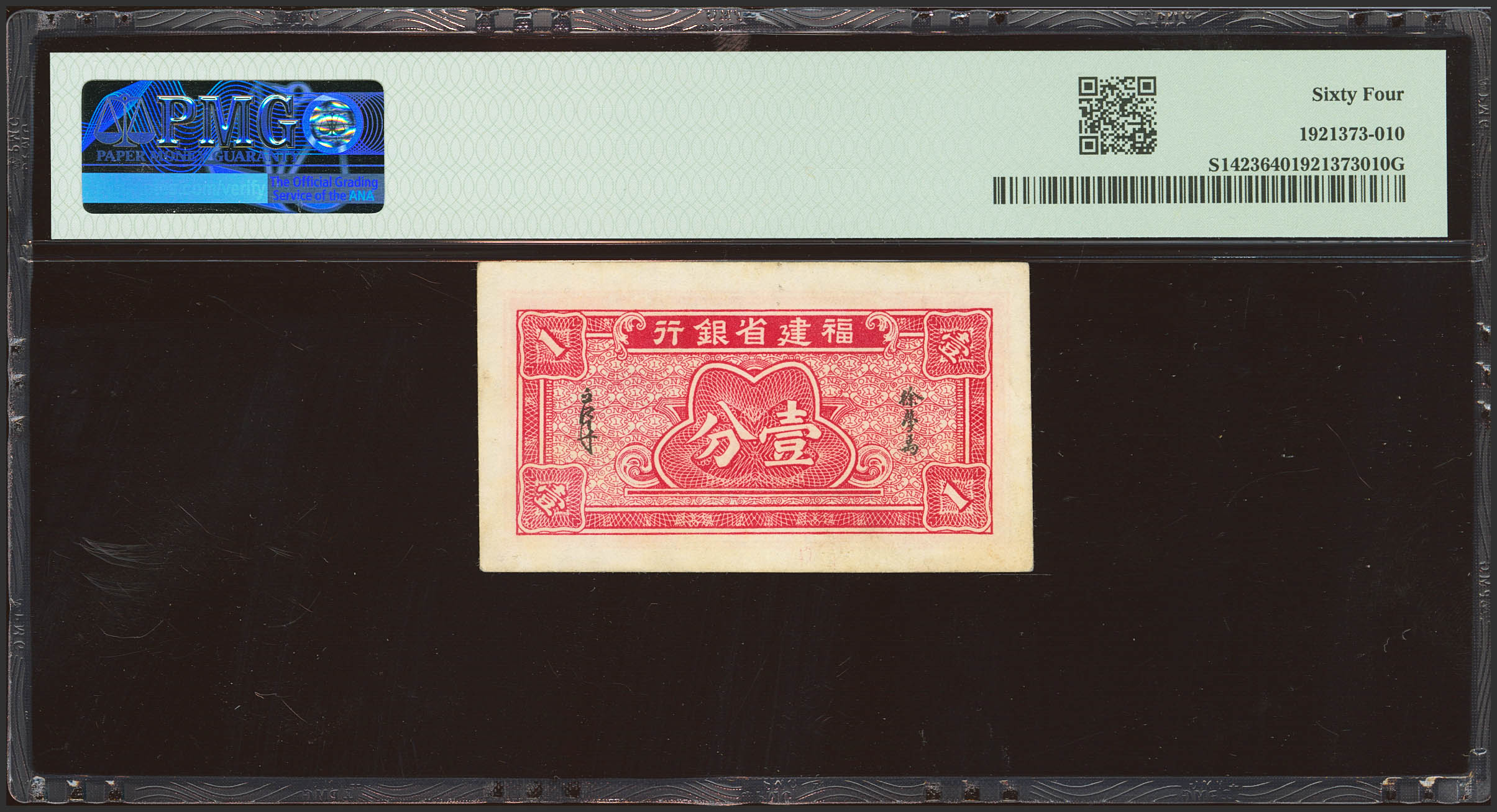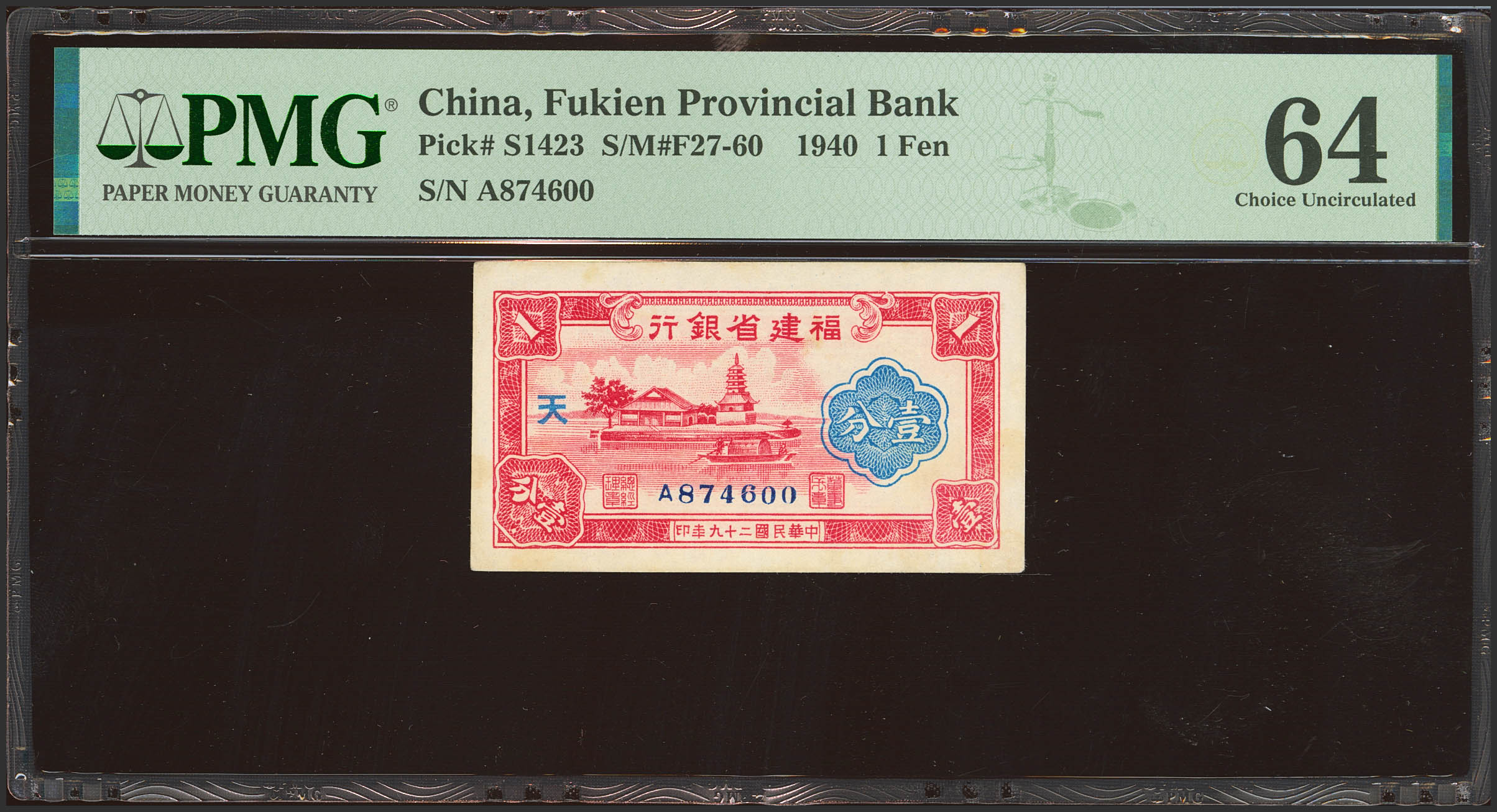 CHINA. 1 Fen. 1940. Fukien Provincial Bank. (Pick: S1423, SM: F27-60). PMG64.