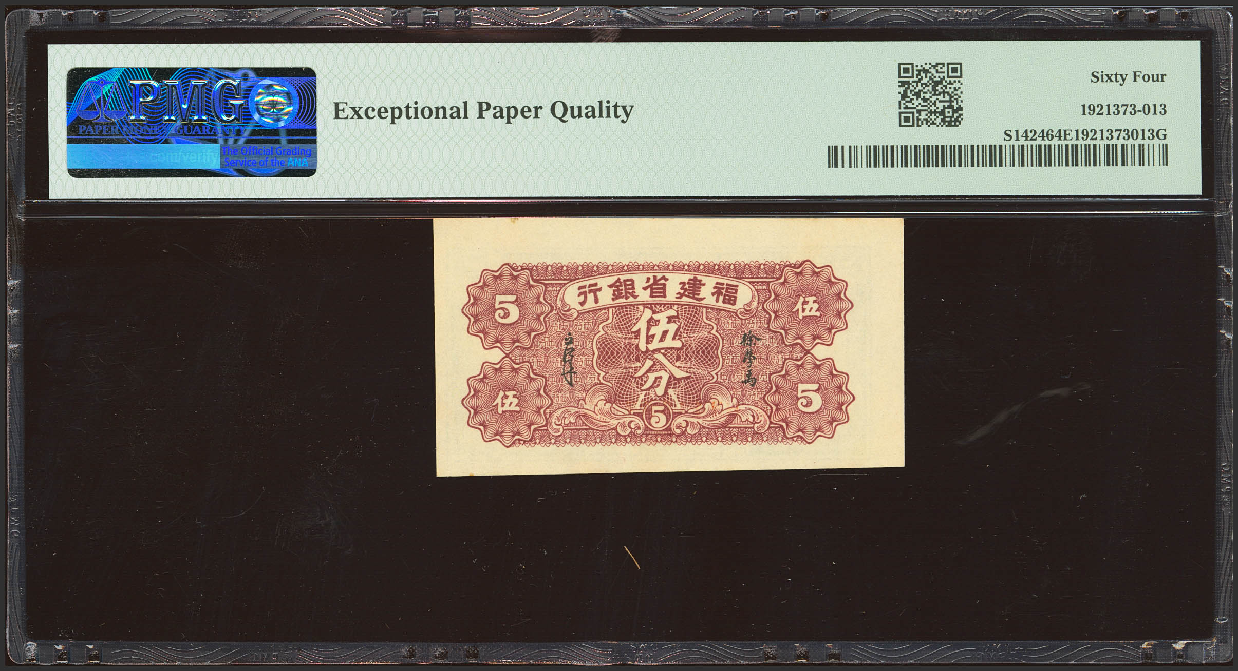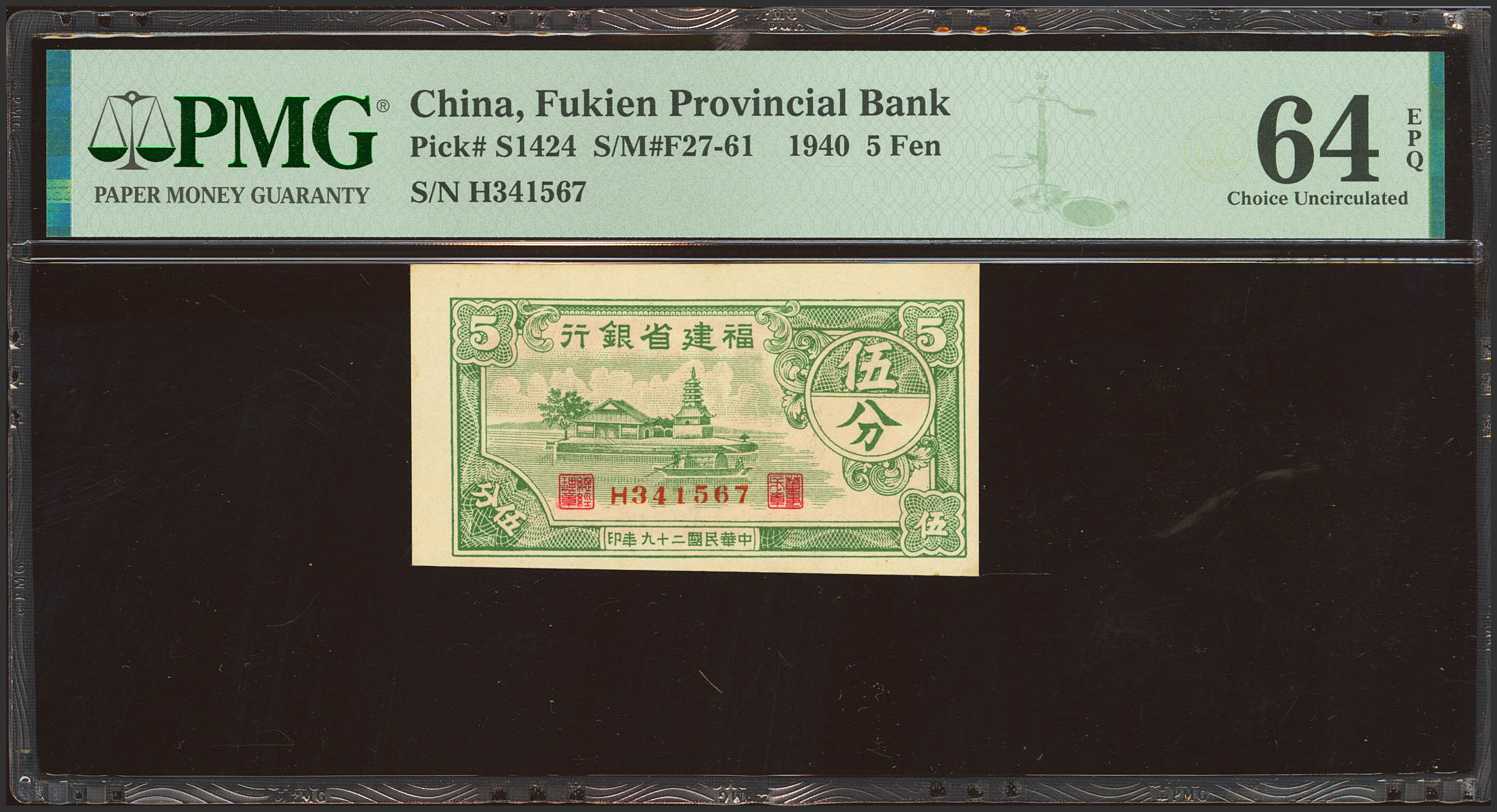 CHINA. 5 Fen. 1940. Fukien Provincial Bank. (Pick: S1424, SM: F27-61). PMG64EPQ.