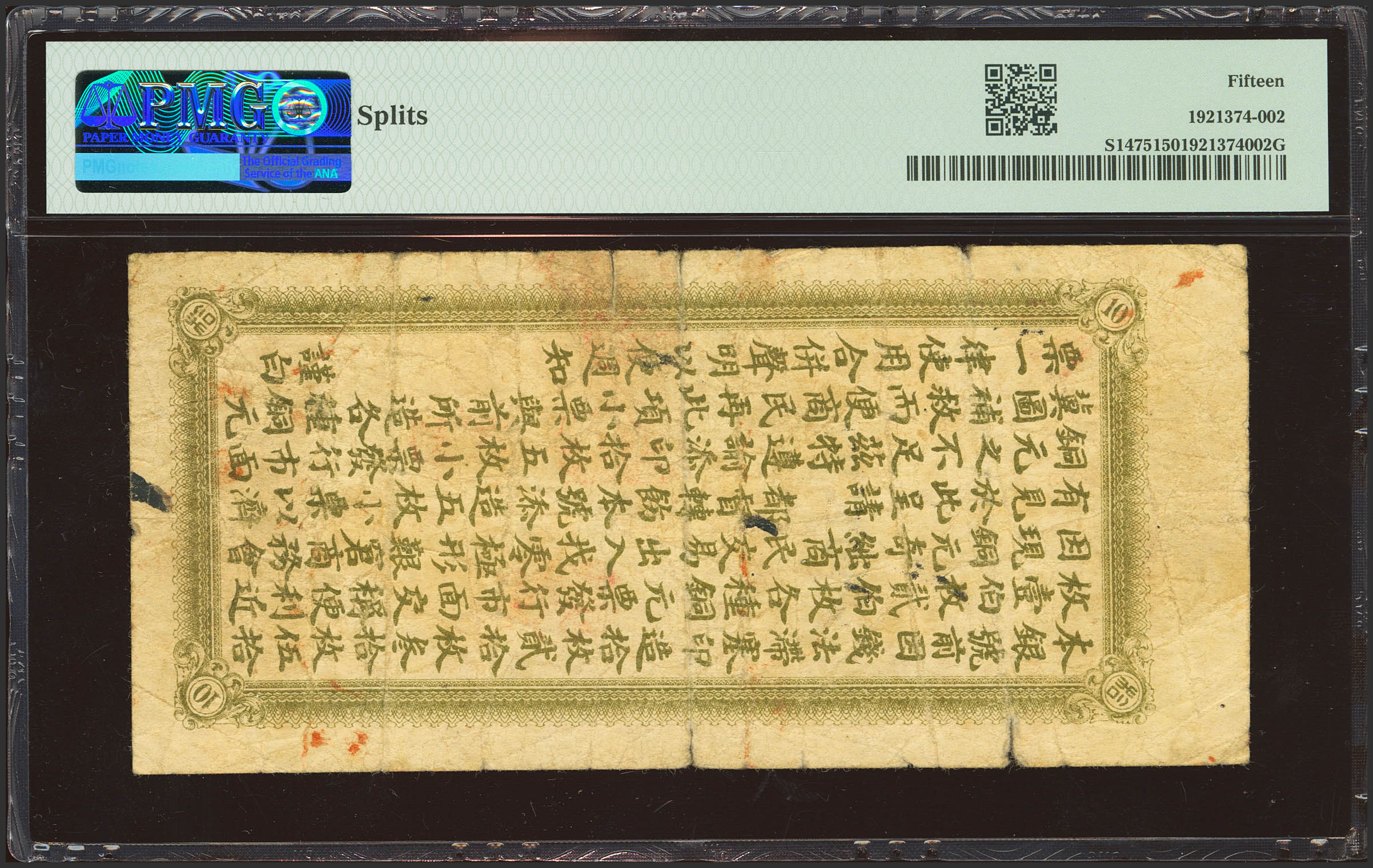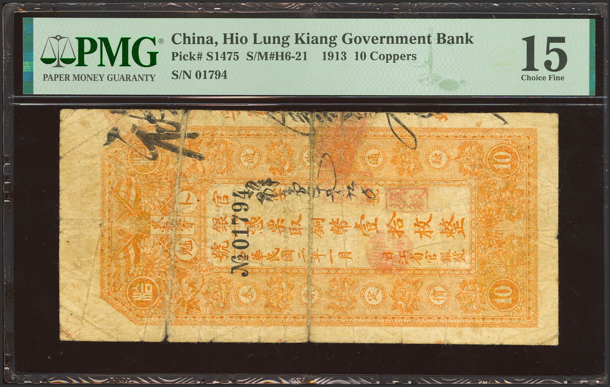 CHINA. 10 Coppers. 1913. Hio Lung Kiang Government Bank. (Pick: S1475, SM: H6-21). PMG15 (splits).