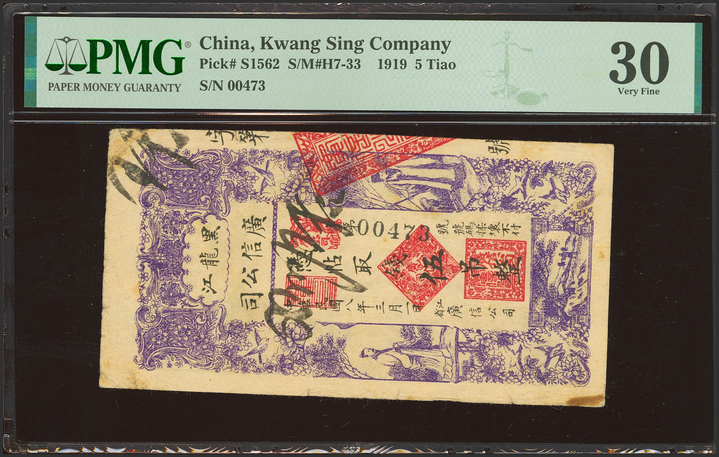CHINA. 5 Tiao. 1919. Kuang Hsin Company. Heilungkiang. (Pick: S1562, SM: H7-33). PMG30 (corner stains, small tears).