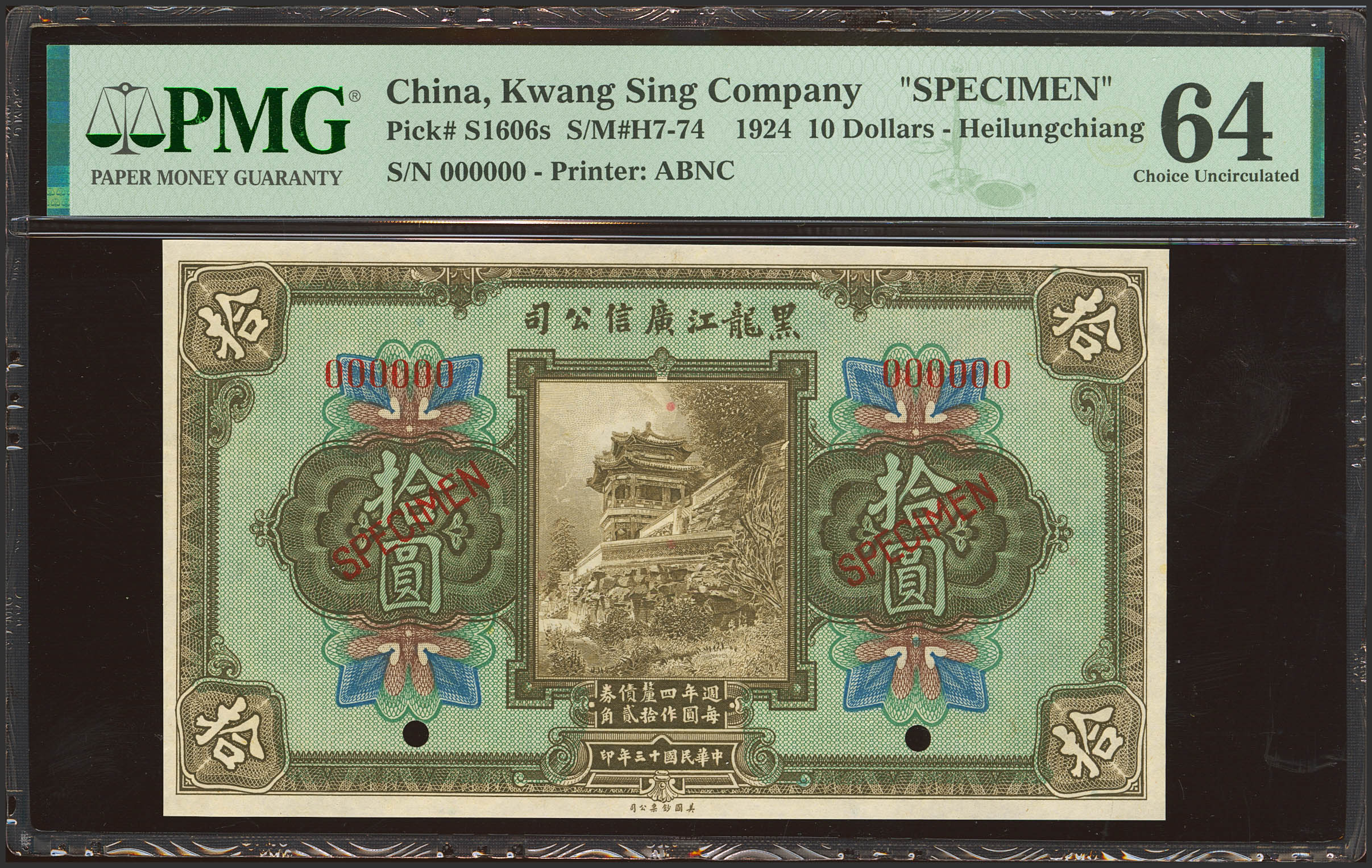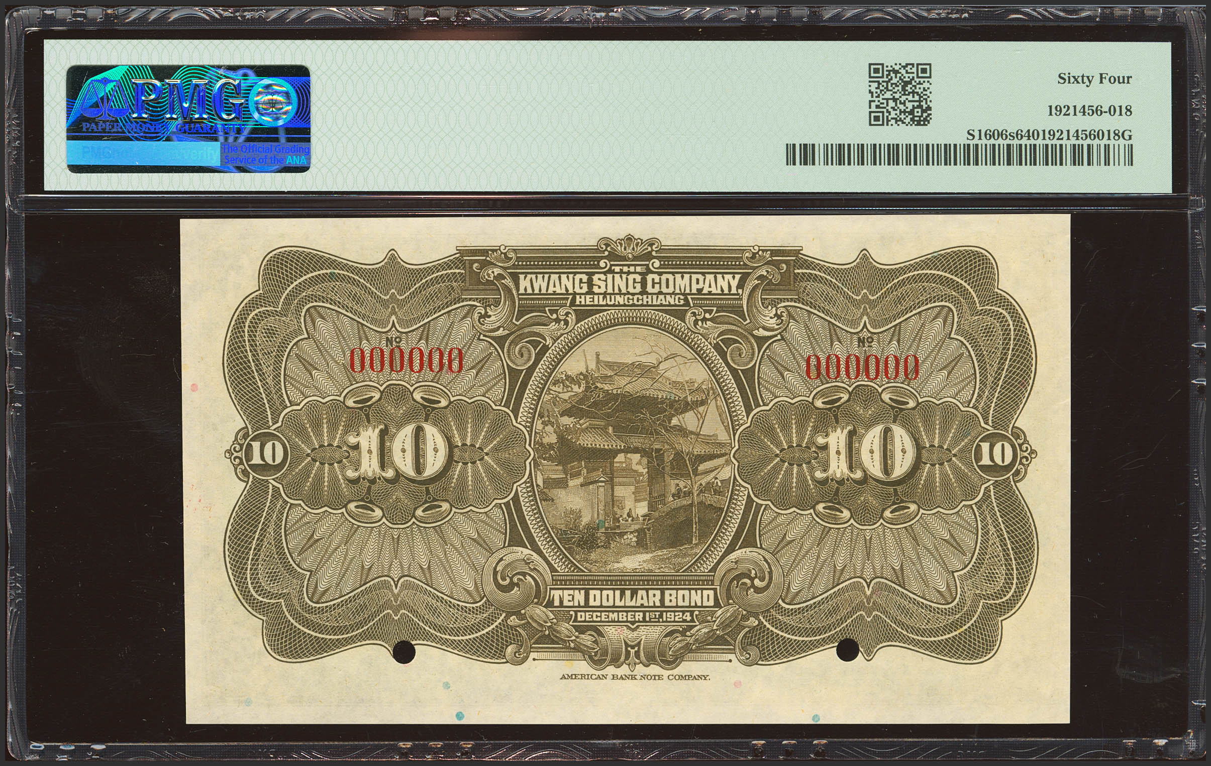 CHINA. 10 Dollars. 1 December 1924. Kwang Sing Company. Heilungchiang. Specimen. (Pick: S1606s, SM: H7-74). PMG64.