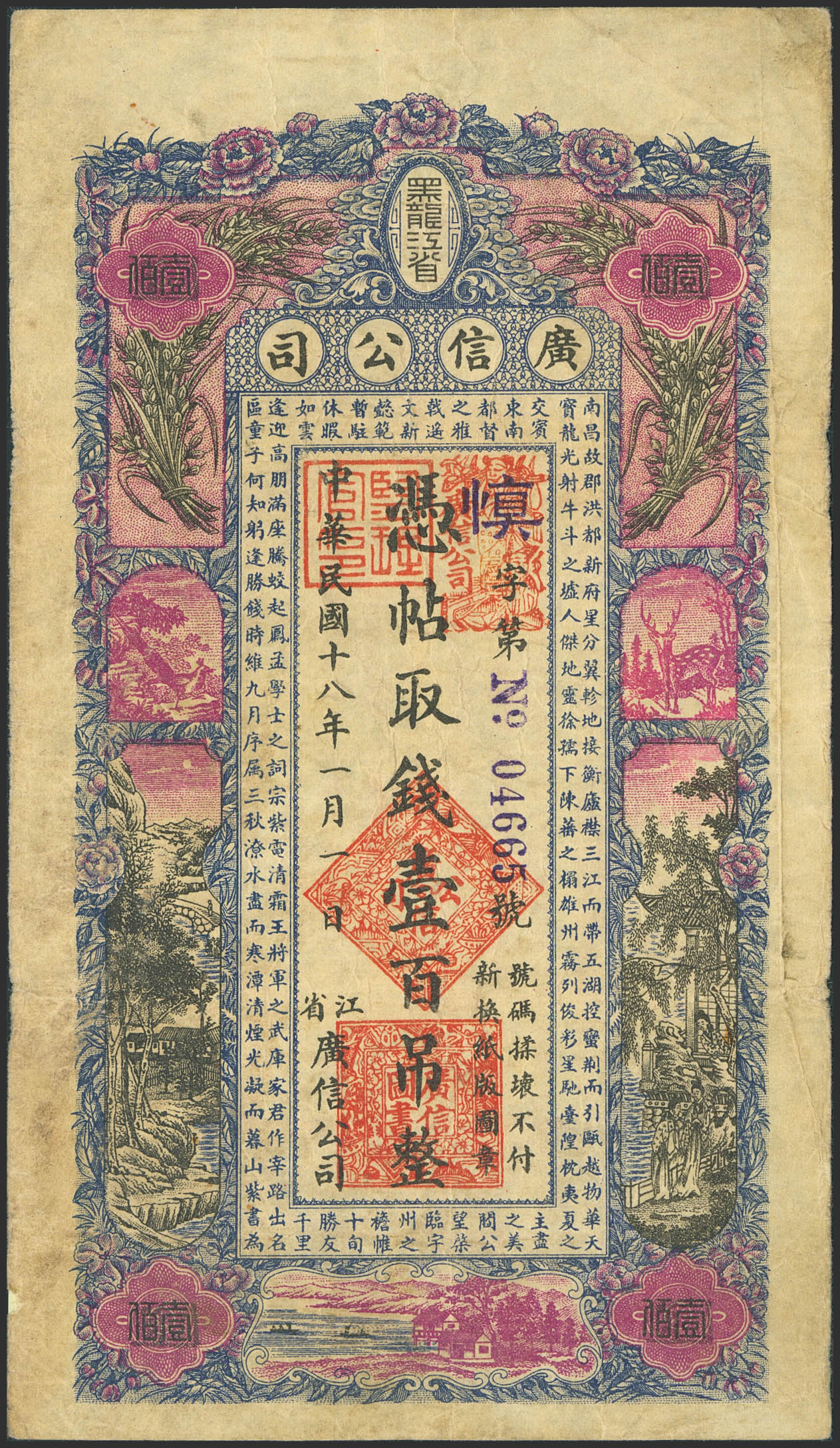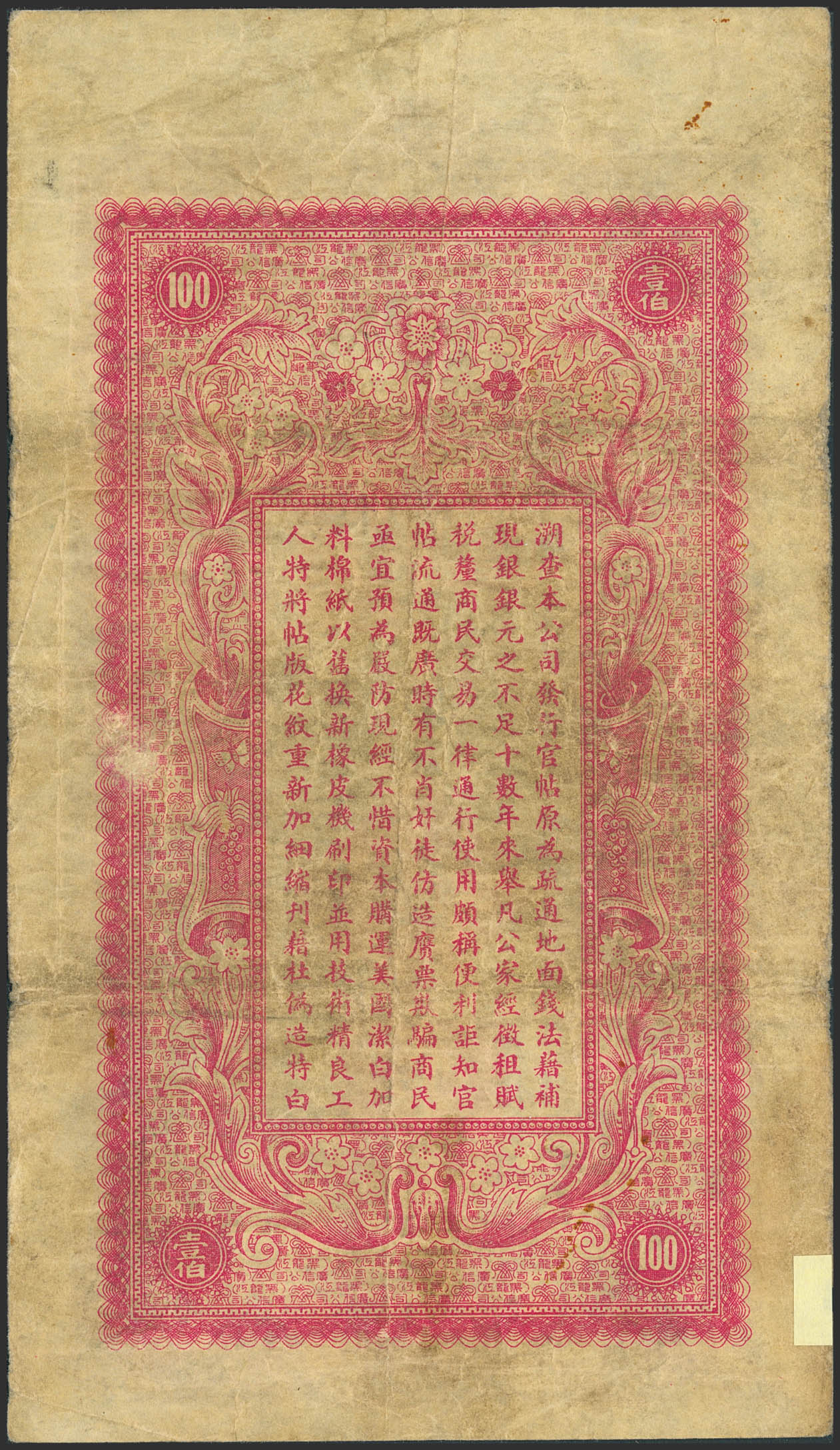 CHINA. 100 Tiao. 1929. Kuang Hsin Syndicate of Heilungchiang. (Pick: S1619G). Adhesive paper added over a small nick on the edge. Fine.