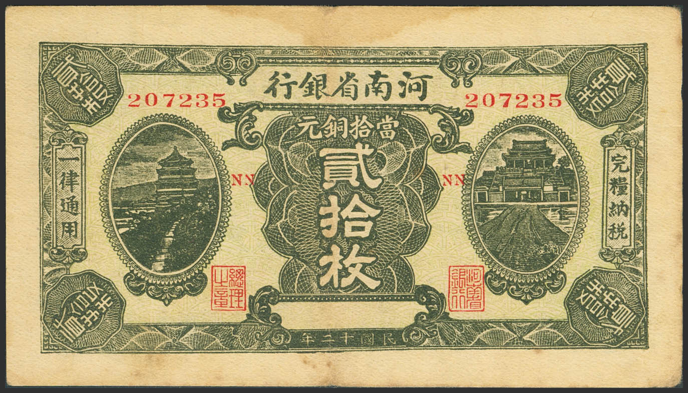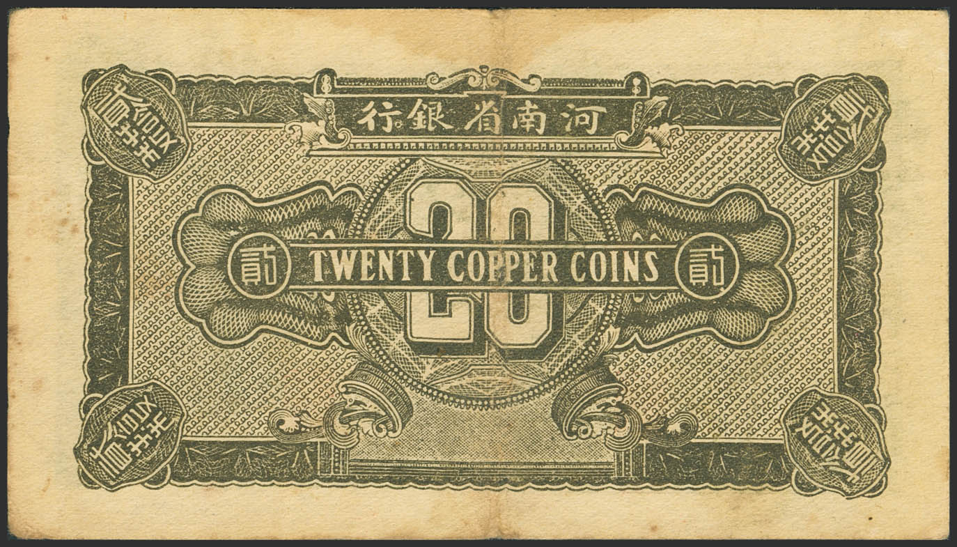 English CHINA. 20 Coppers. 1923. Provincial Bank of Honan. (Pick: S1679a). More than Extremely Fine.