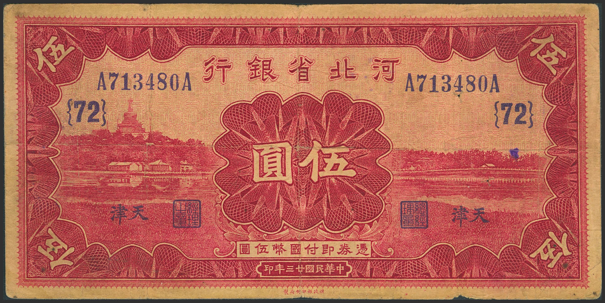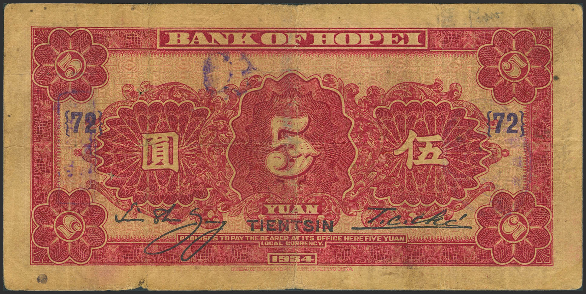 English CHINA. 5 Yuan. 1934. Bank of Hopei. Tientsin. (Pick: S1731c). Pinholes. More than Fine.