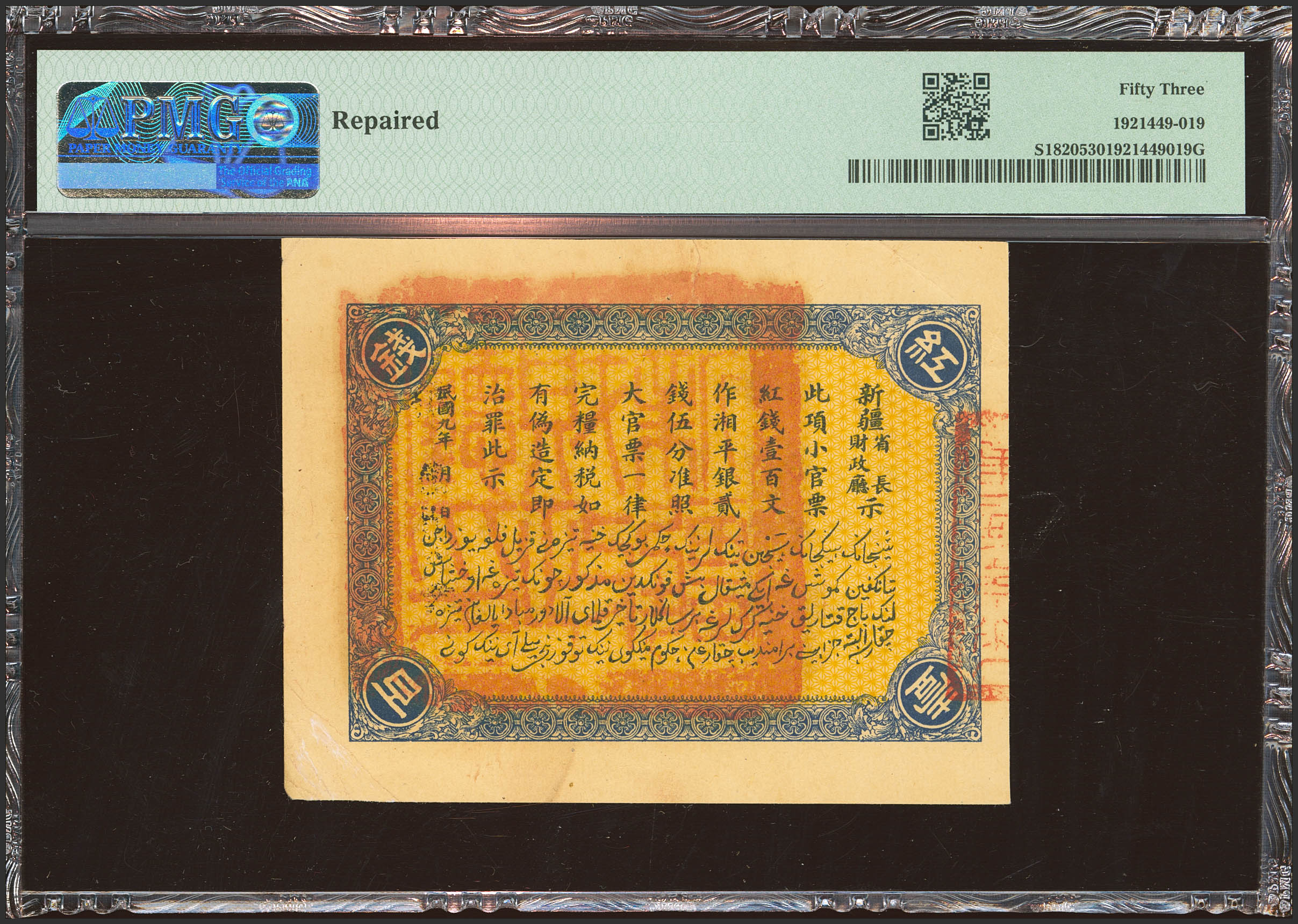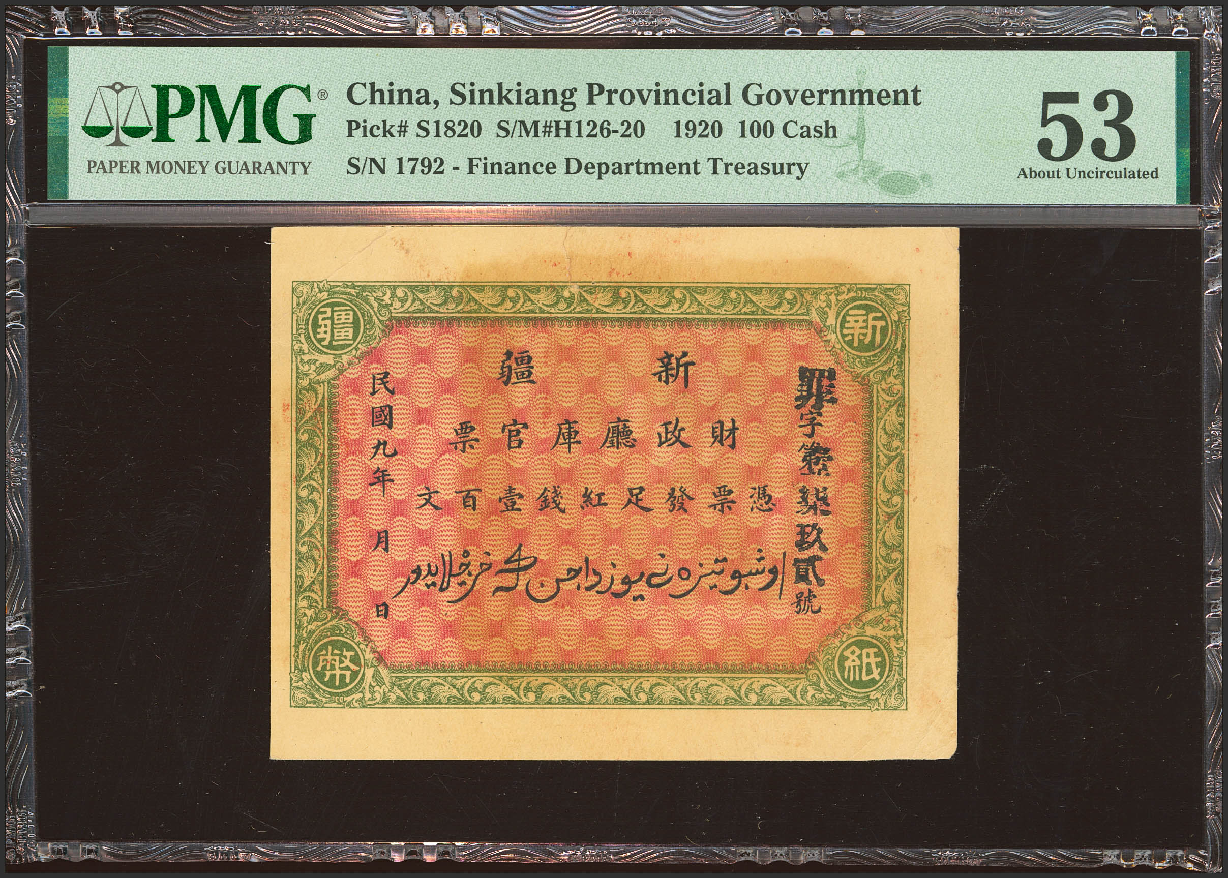 CHINA. 100Cash. 1920. Sinkiang Provincial Government. Finance Department Treasury. (Pick: S1820, SM: H126-20). PMG53 (repaired).