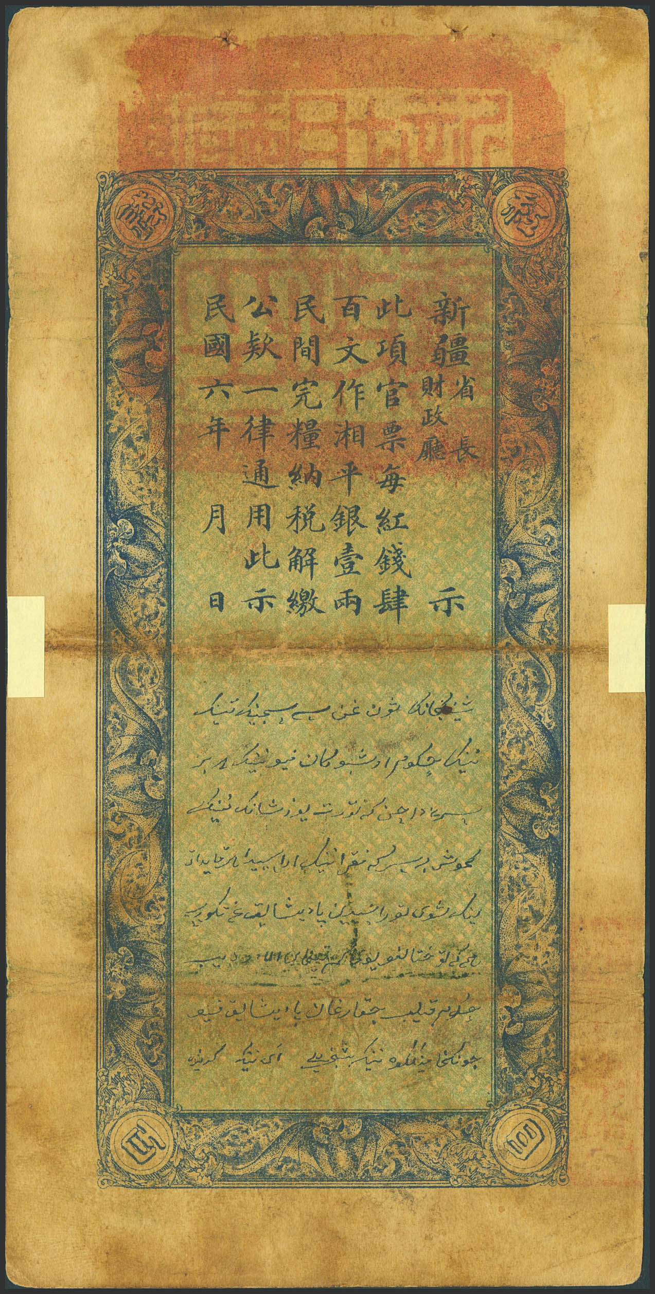 CHINA. 400 Cash. 1921. Sinkiang Sub-Prefecture Administration Finance Department Treasury. (Pick: S1825). Removable adhesive paper added over tears. Very Fine.