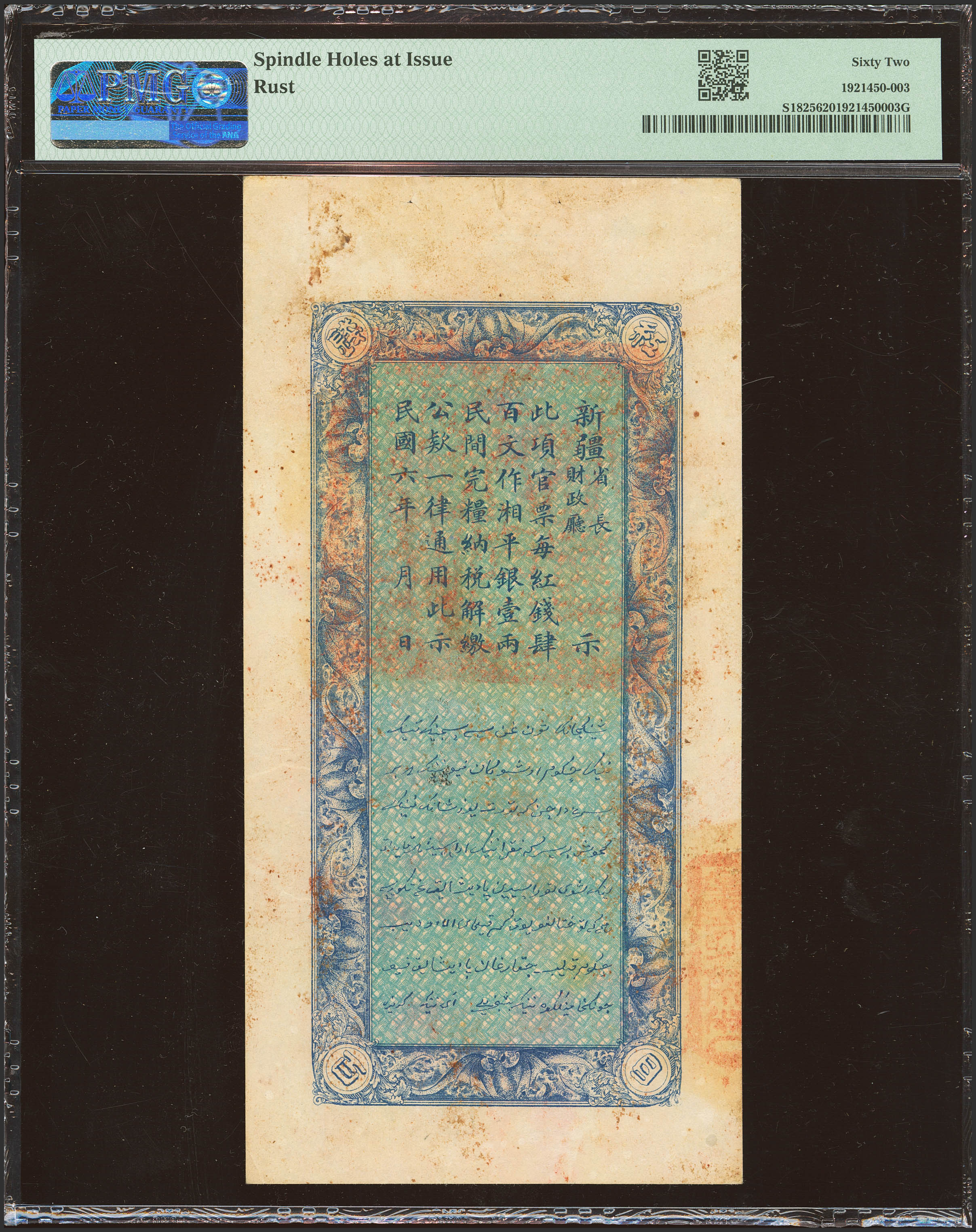 CHINA. 400 Cash. 1921. Sinkiang Sub-Prefecture Administration Finance Department Treasury. (Pick: S1825, SM: H126-30). PMG62 (spindle holes at issue, rust).