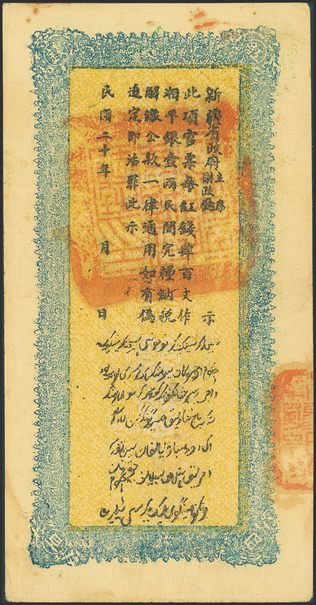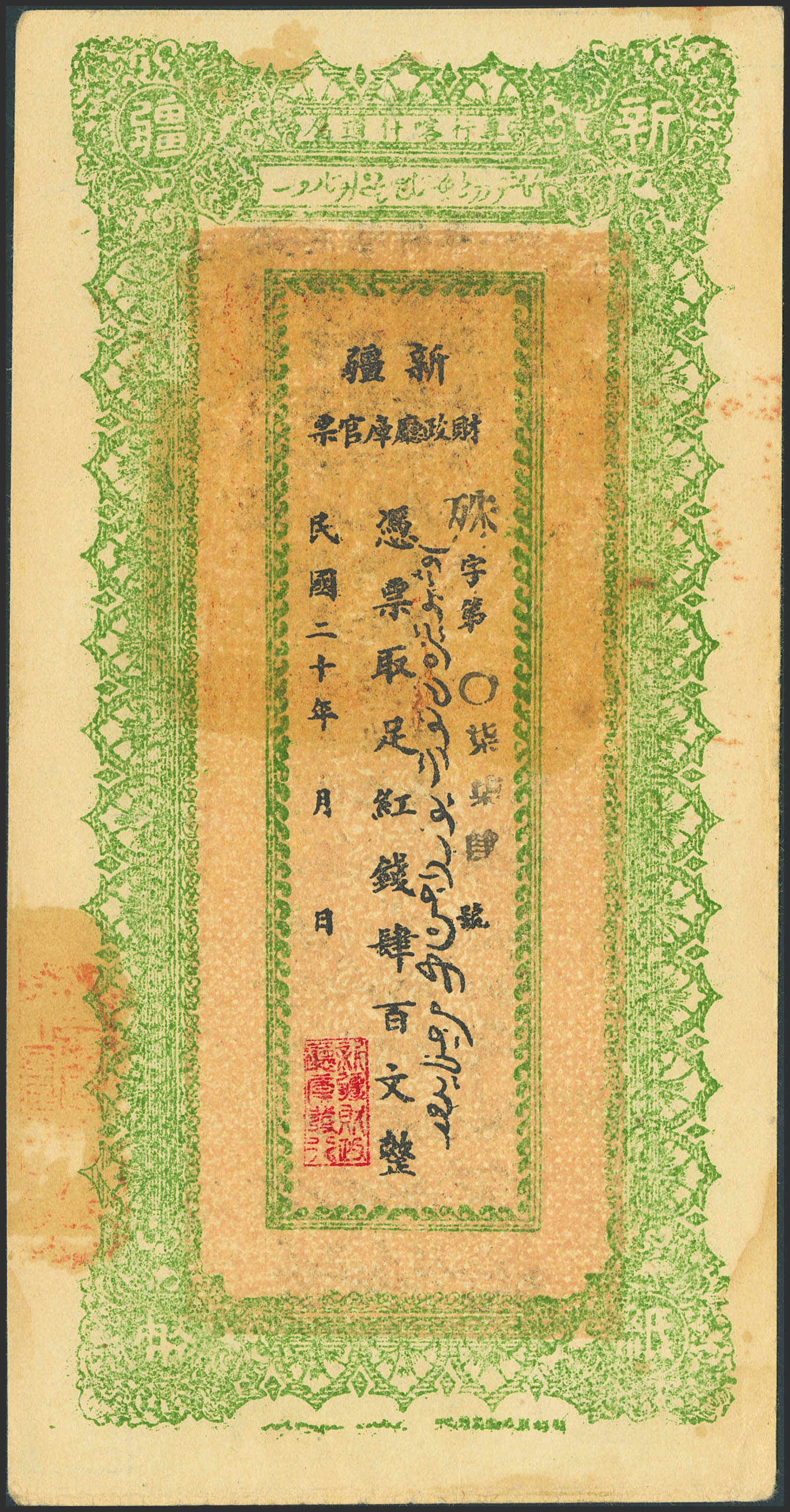 CHINA. 400 Cash. 1931. Sinkiang Sub-Prefecture Administration Finance Department Treasury. (Pick: S1851). Extremely Fine.