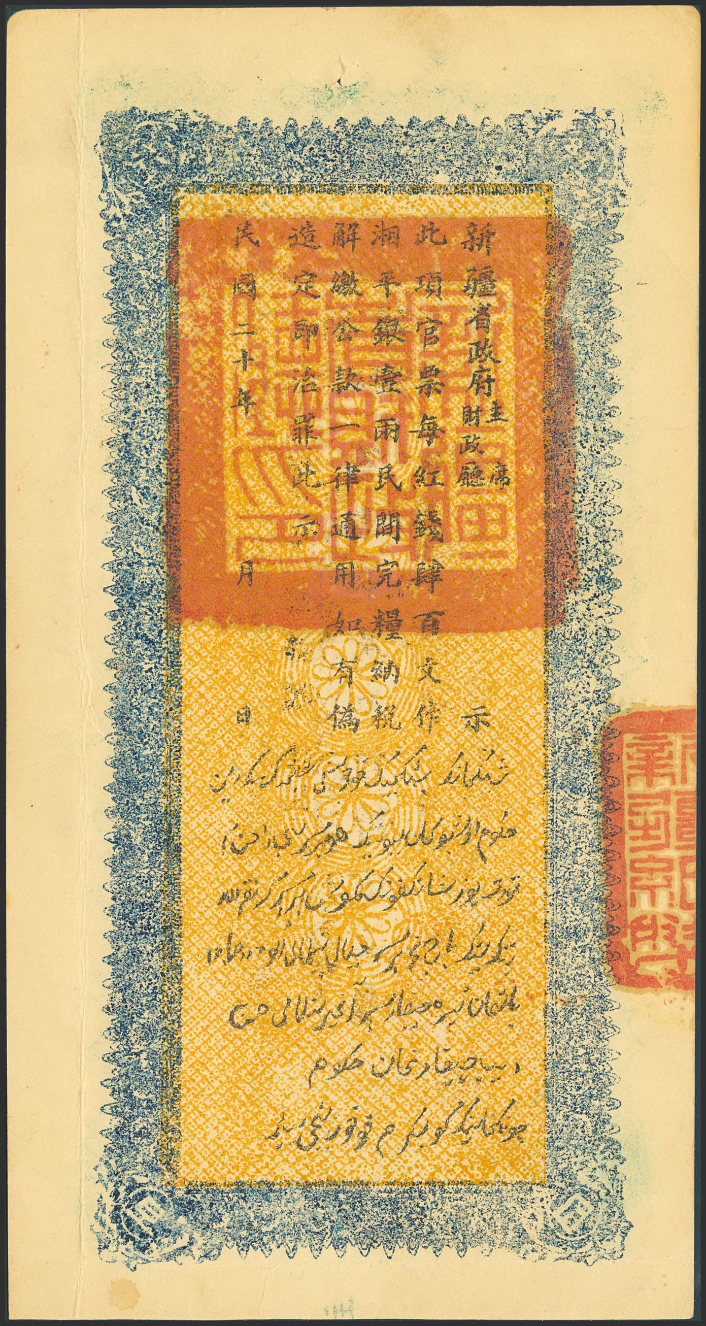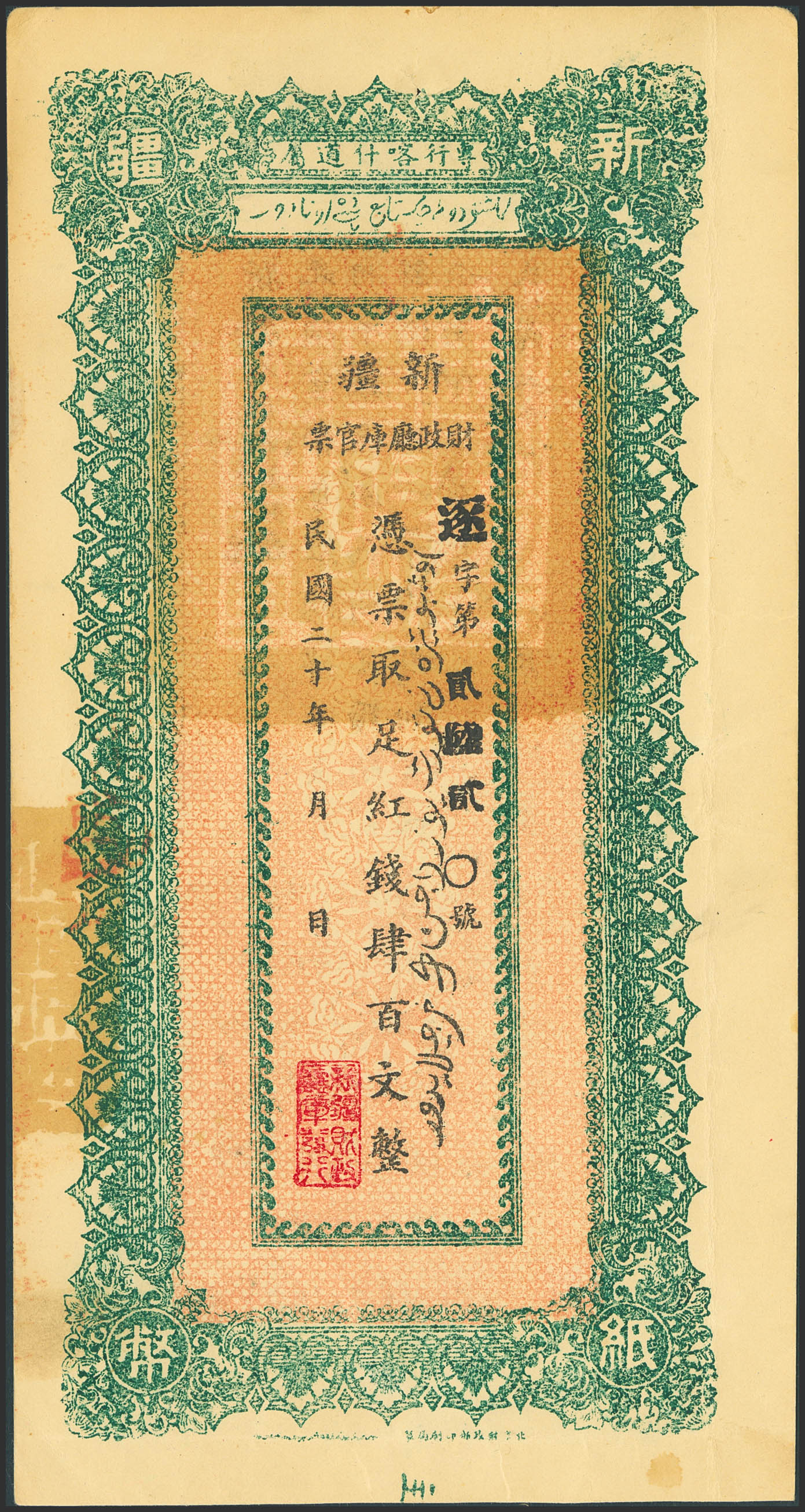 CHINA. 400 Cash. 1931. Sinkiang Sub-Prefecture Administration Finance Department Treasury. (Pick: S1851). Spindle hole. Almost Uncirculated.