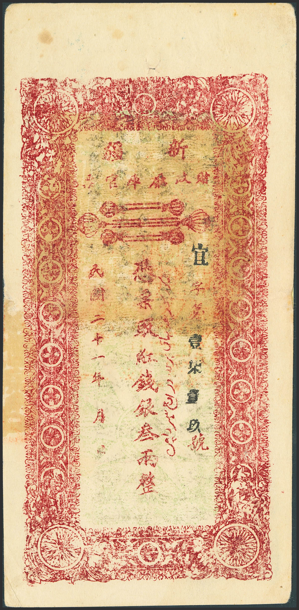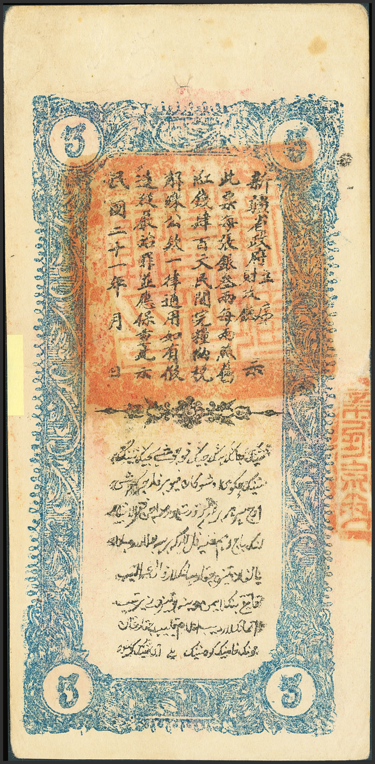 CHINA. 3 Taels. 1932. Sinkiang Sub-Prefecture Administration Finance Department Treasury. (Pick: S1868). Spindlehole. More than Very Fine.