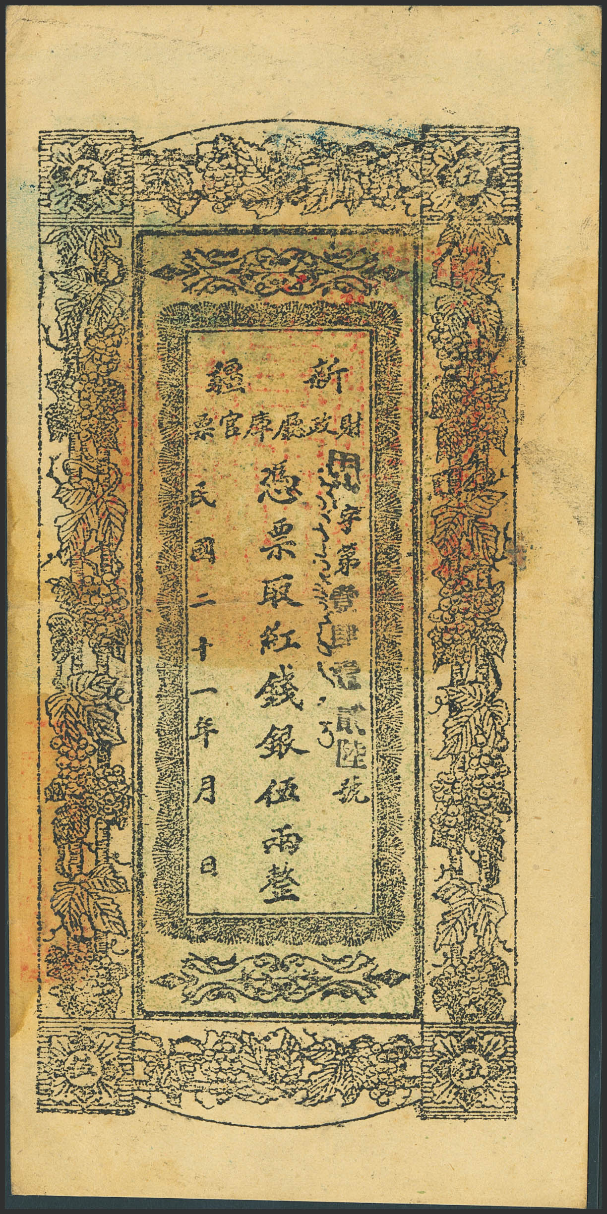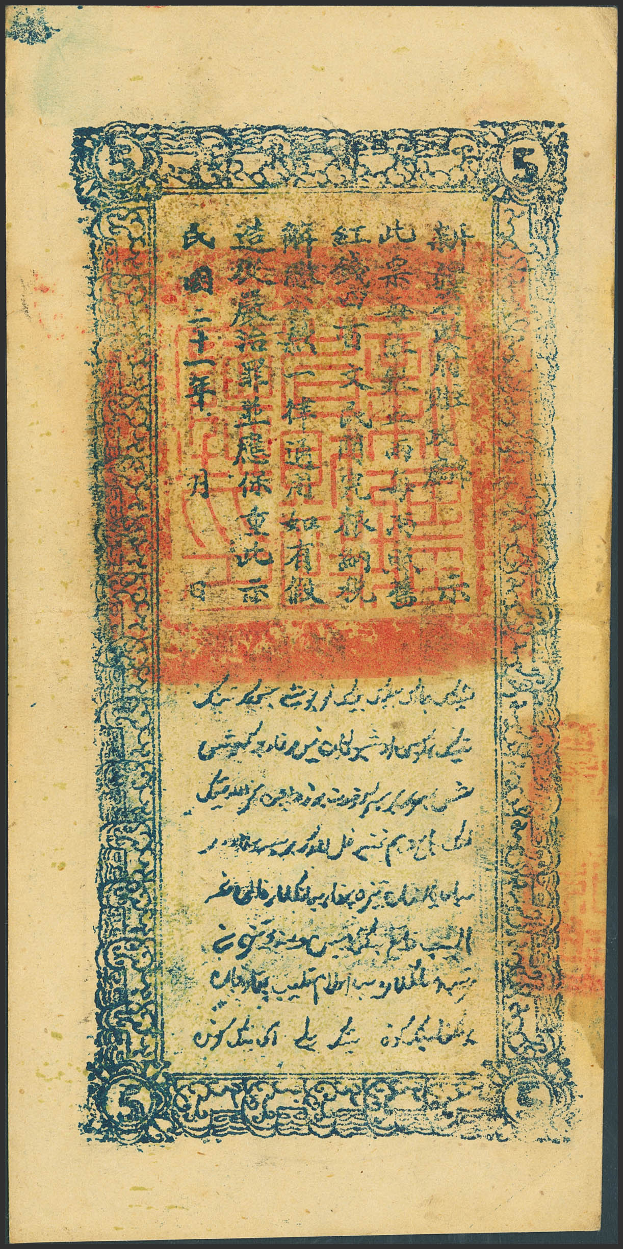 CHINA. 5 Taels. 1932. Sinkiang Sub-Prefecture Administration Finance Department Treasury. (Pick: S1869). Pinholes. More than Extremely Fine.