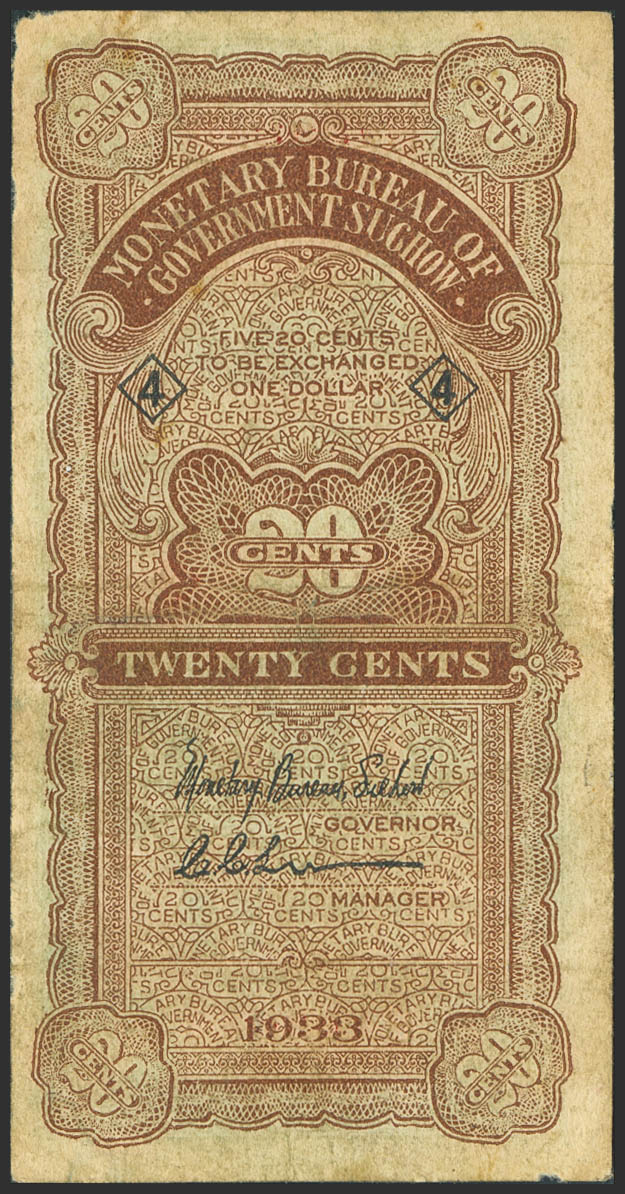 CHINA. 20 Cents. 1933. Monetary Bureau of Government Suchow. (Pick: S1891Bb). Fine.
