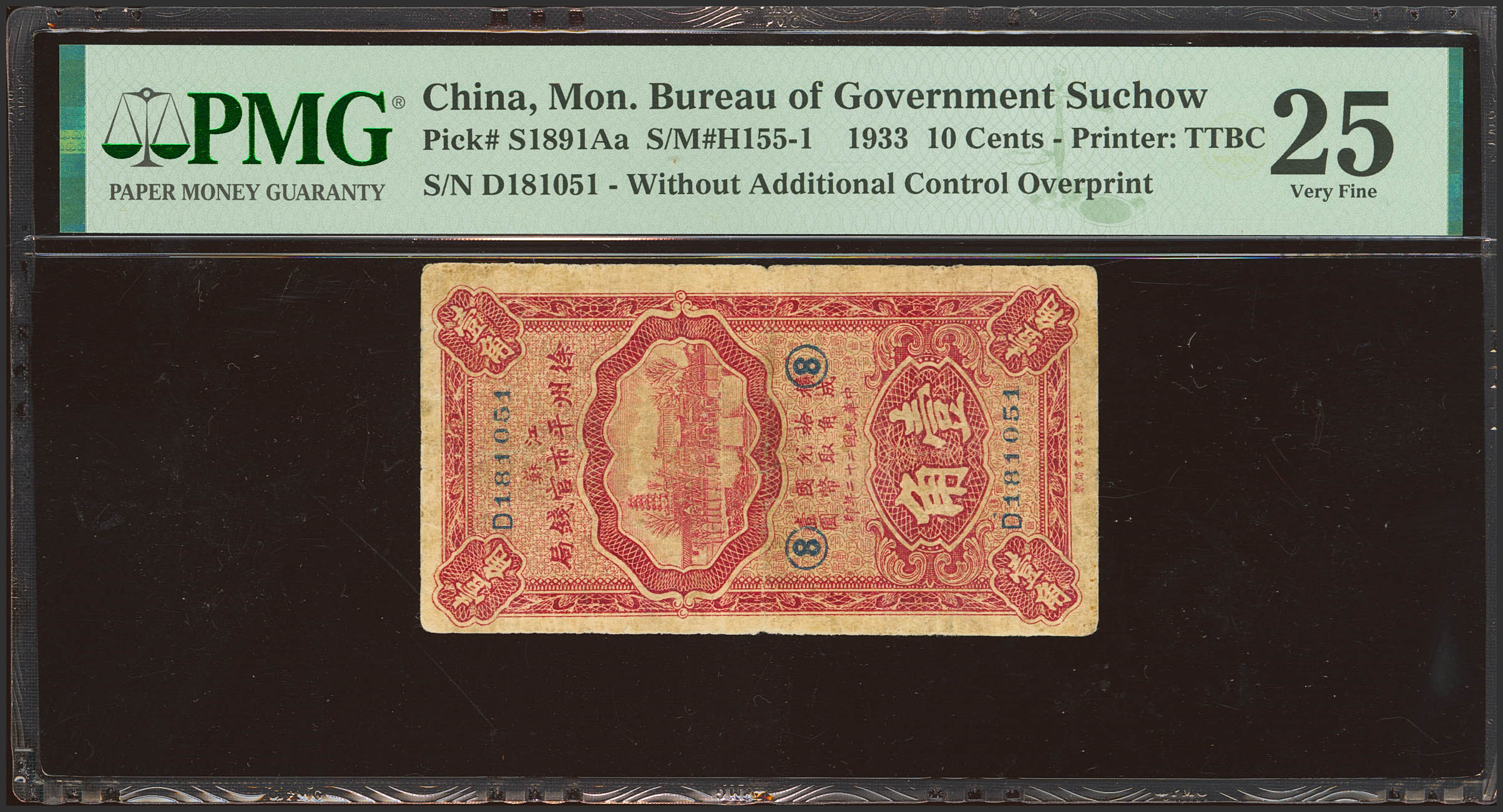 CHINA. 10 Cents. 1933. Monetary Bureau of Government Suchow. (Pick: S1891Ab, SM: H155-1). PMG25.