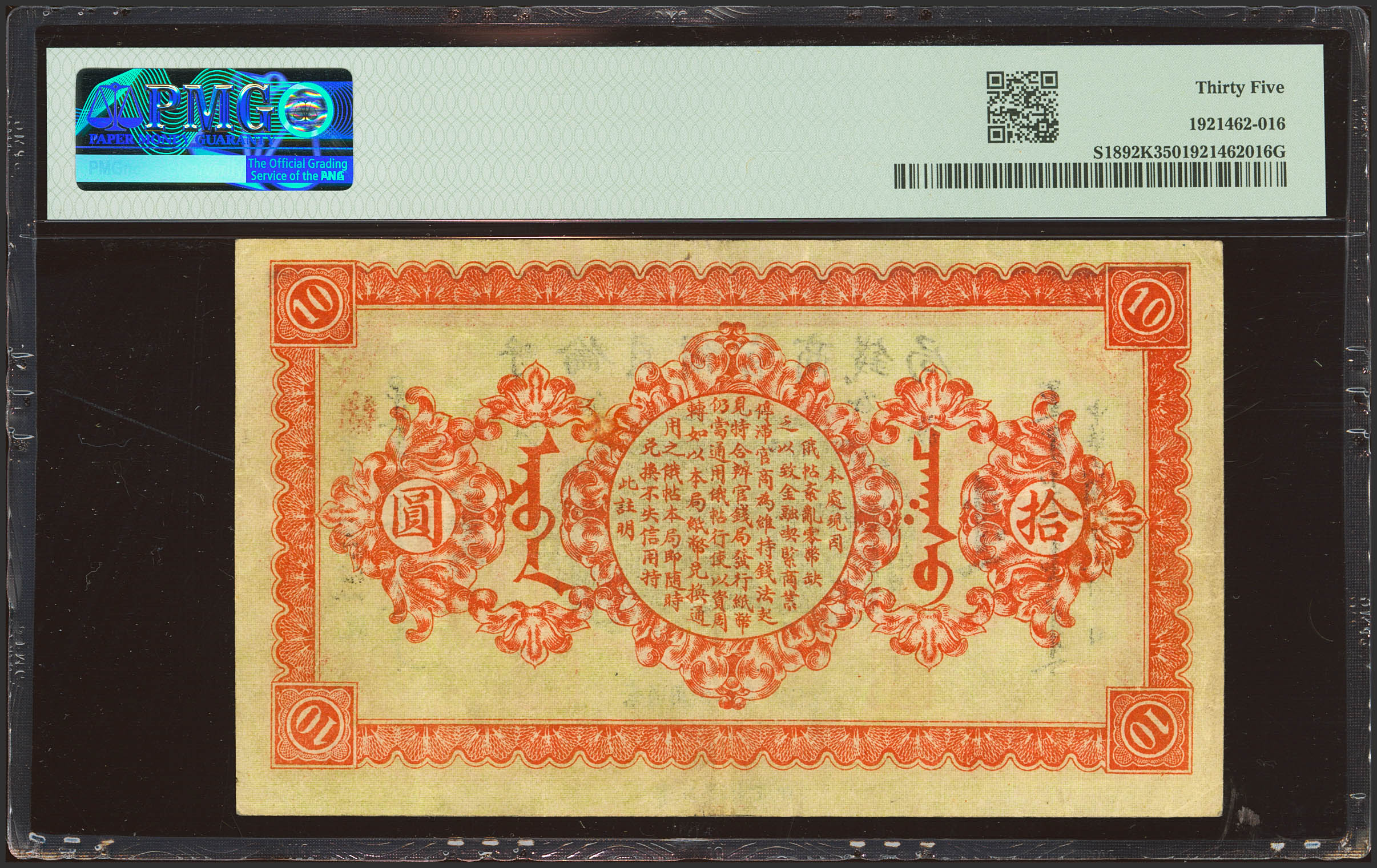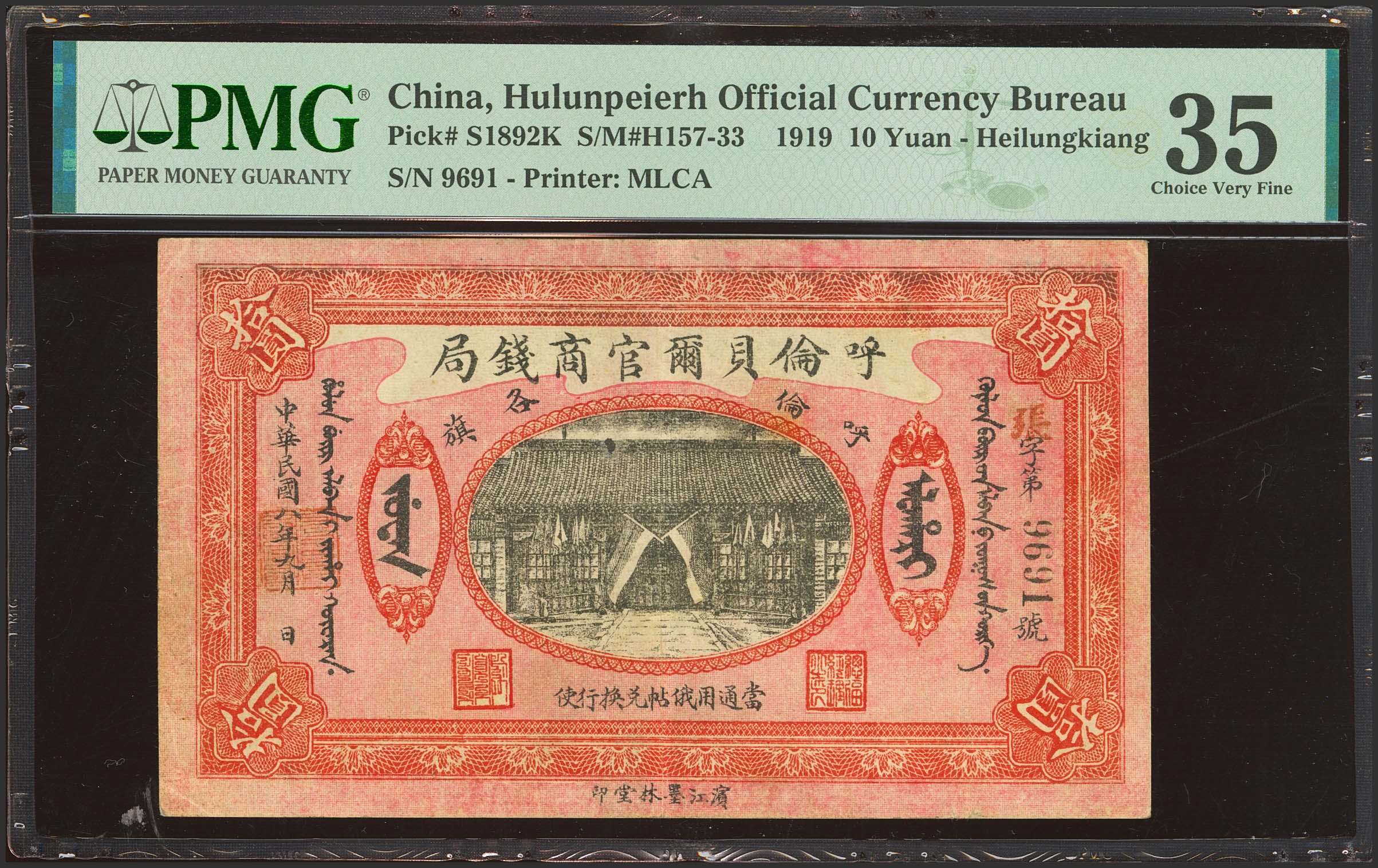 English CHINA. 10 Yuan. 1919. Hulunpeierh Official Currency Bureau. (Pick: S1892K, SM: H157-33). PMG35.