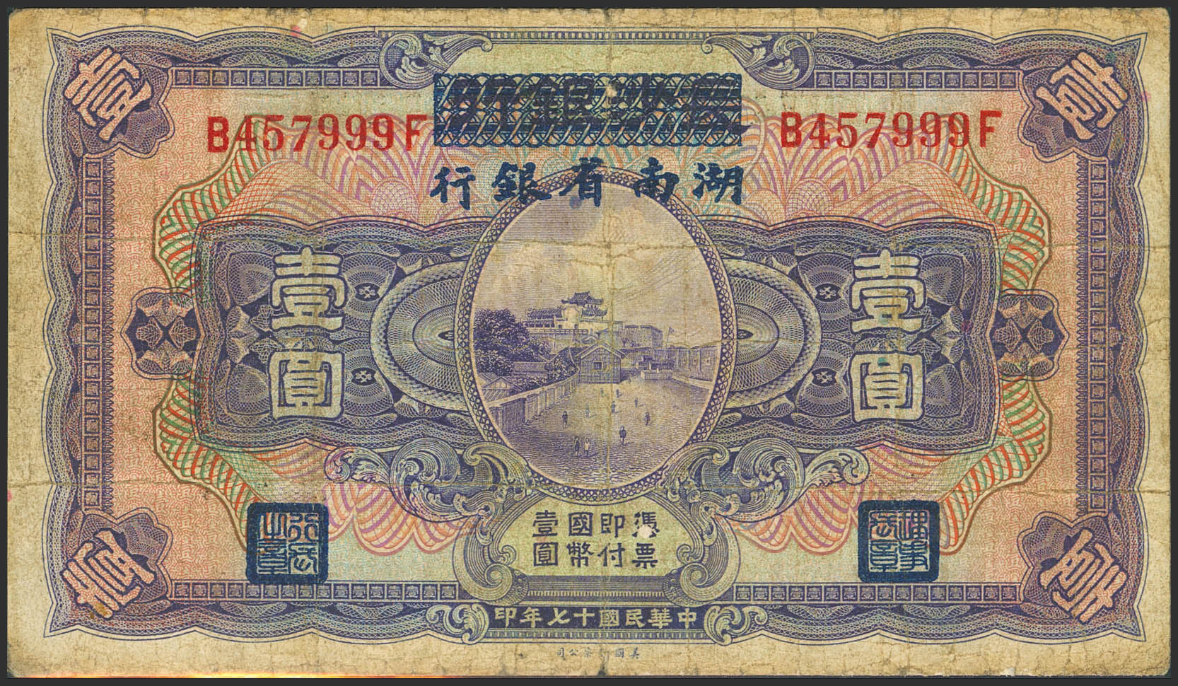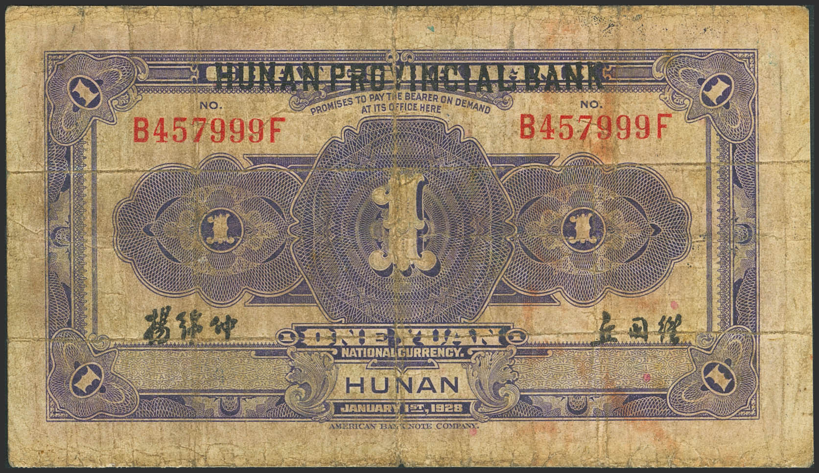 English CHINA. 1 Yuan. 1 January 1928. Hunan Provincial Bank. (Pick: S1951a). More than Fine.