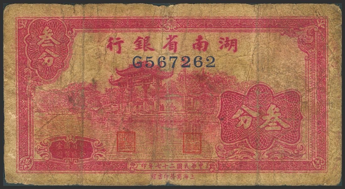 CHINA. 3 Cents. 1938. Hunan Provincial Bank. (Pick: S1988). Very Good.