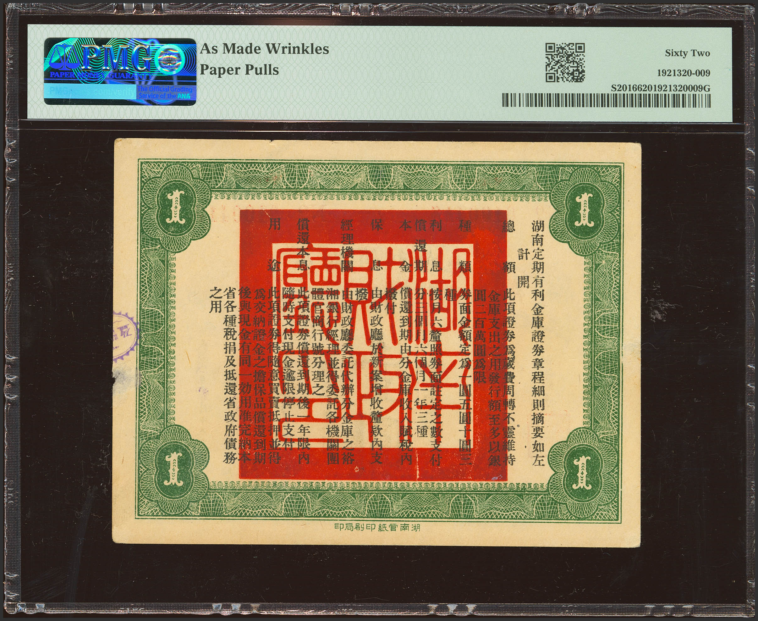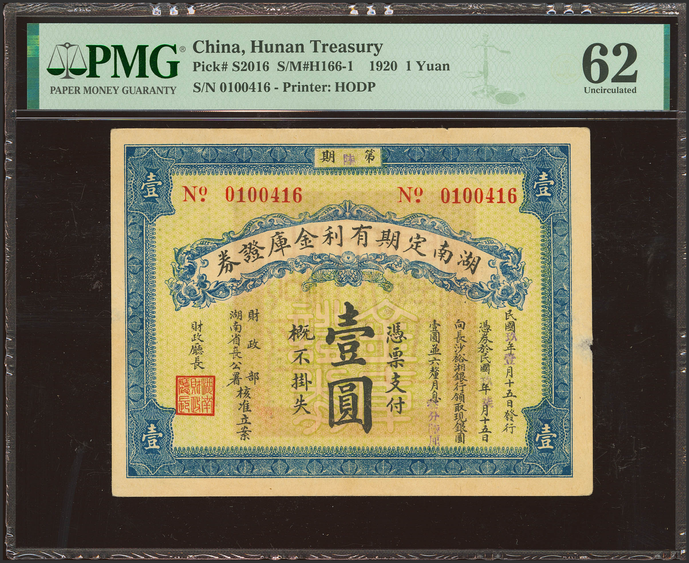 CHINA. 1 Yuan. 1920. Hunan Treasury. Interest-bearing term certificate. (Pick: S2016, SM: H166-1). PMG62 (as made wrinkles, paper pulls).