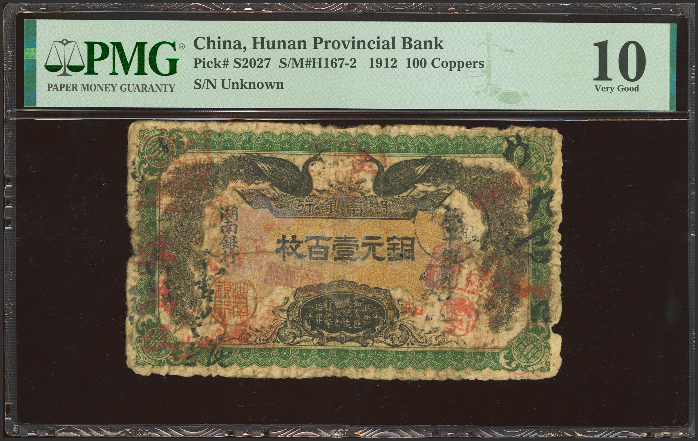 English CHINA. 100 Coppers. 1912. Hunan Bank. (Pick: S2027, SM: H167-2). PMG10 (ink).