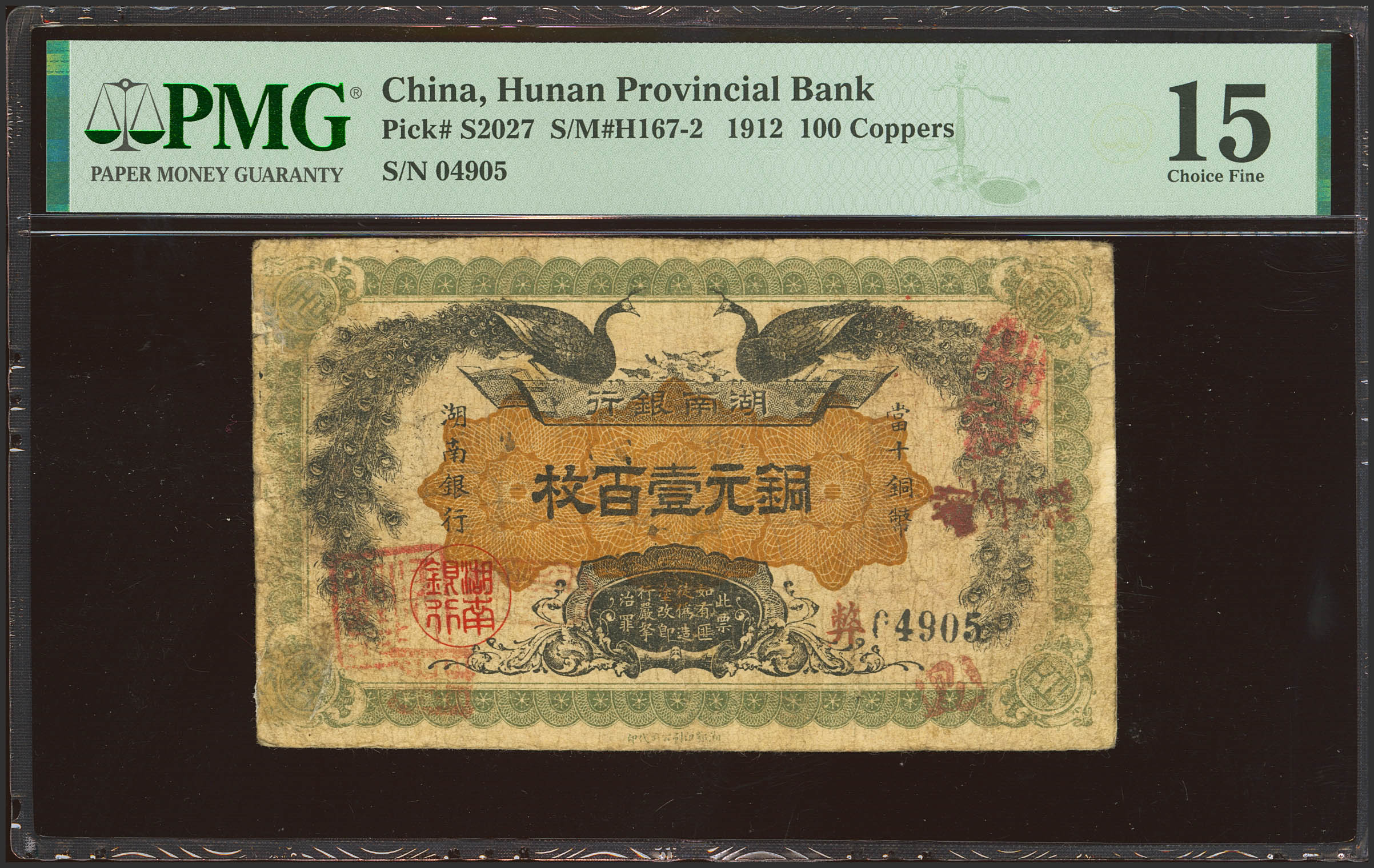 CHINA. 100 Coppers. 1912. Hunan Bank. (Pick: S2027, SM: H167-2). PMG15 (tape, ink).