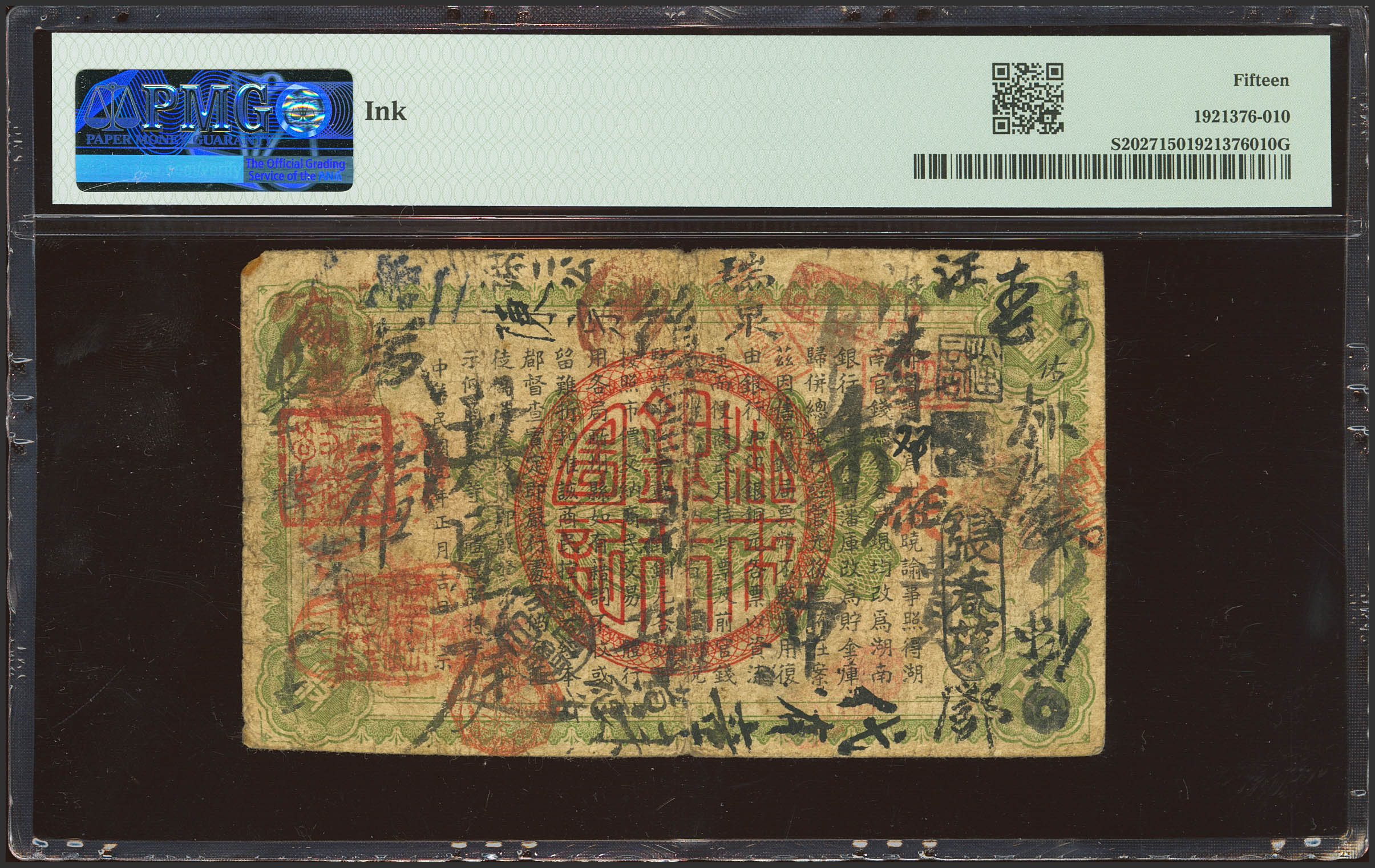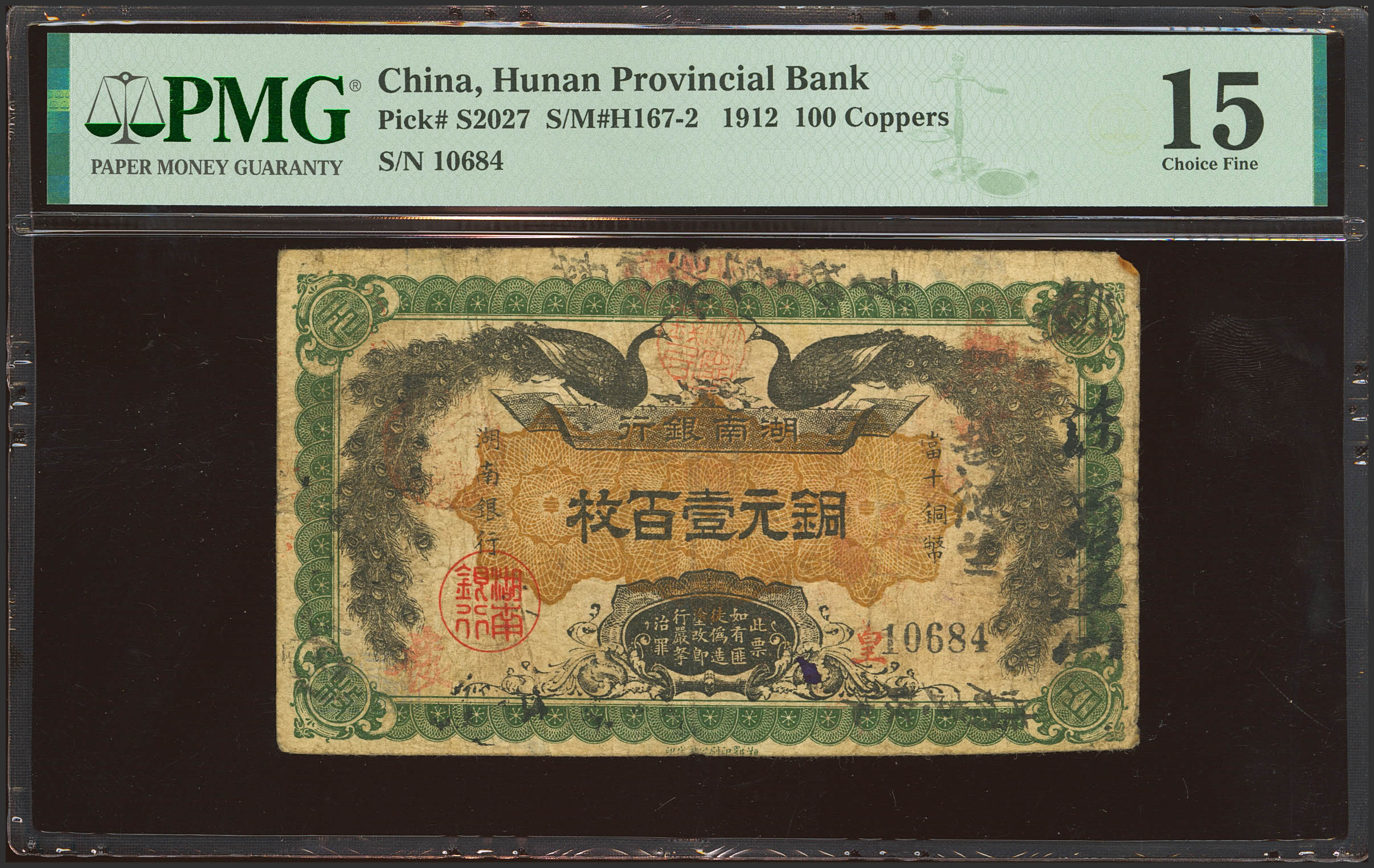 English CHINA. 100 Coppers. 1912. Hunan Bank. (Pick: S2027, SM: H167-2). Pinhole. PMG15 (ink).