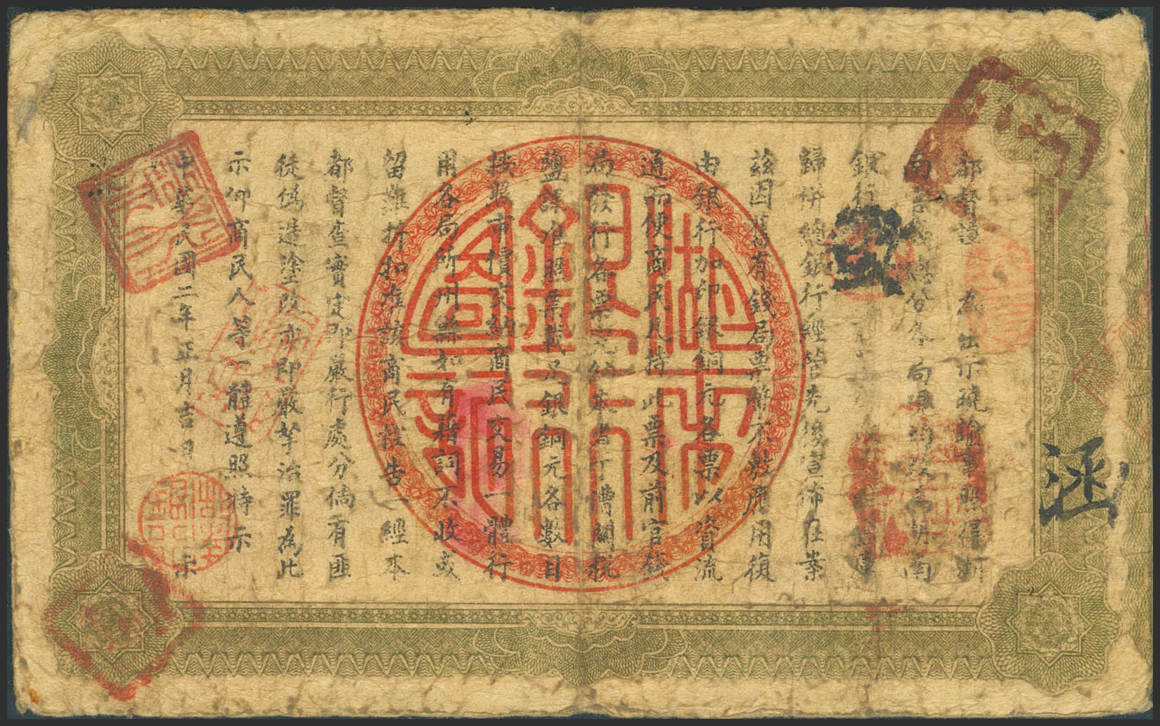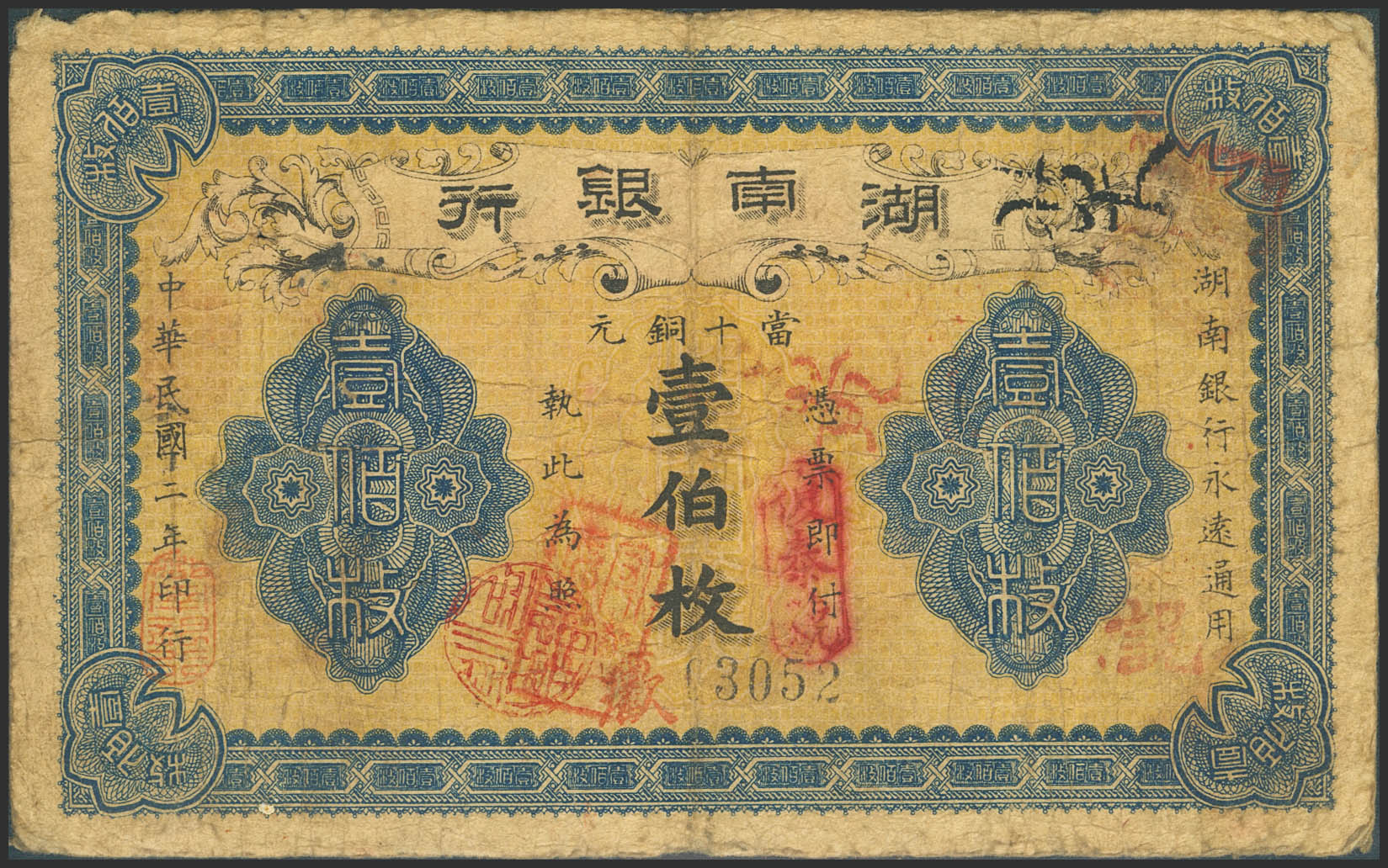 CHINA. 100 Coppers. 1913. Hunan Bank. (Pick: S2040). Pinhole. Fine.
