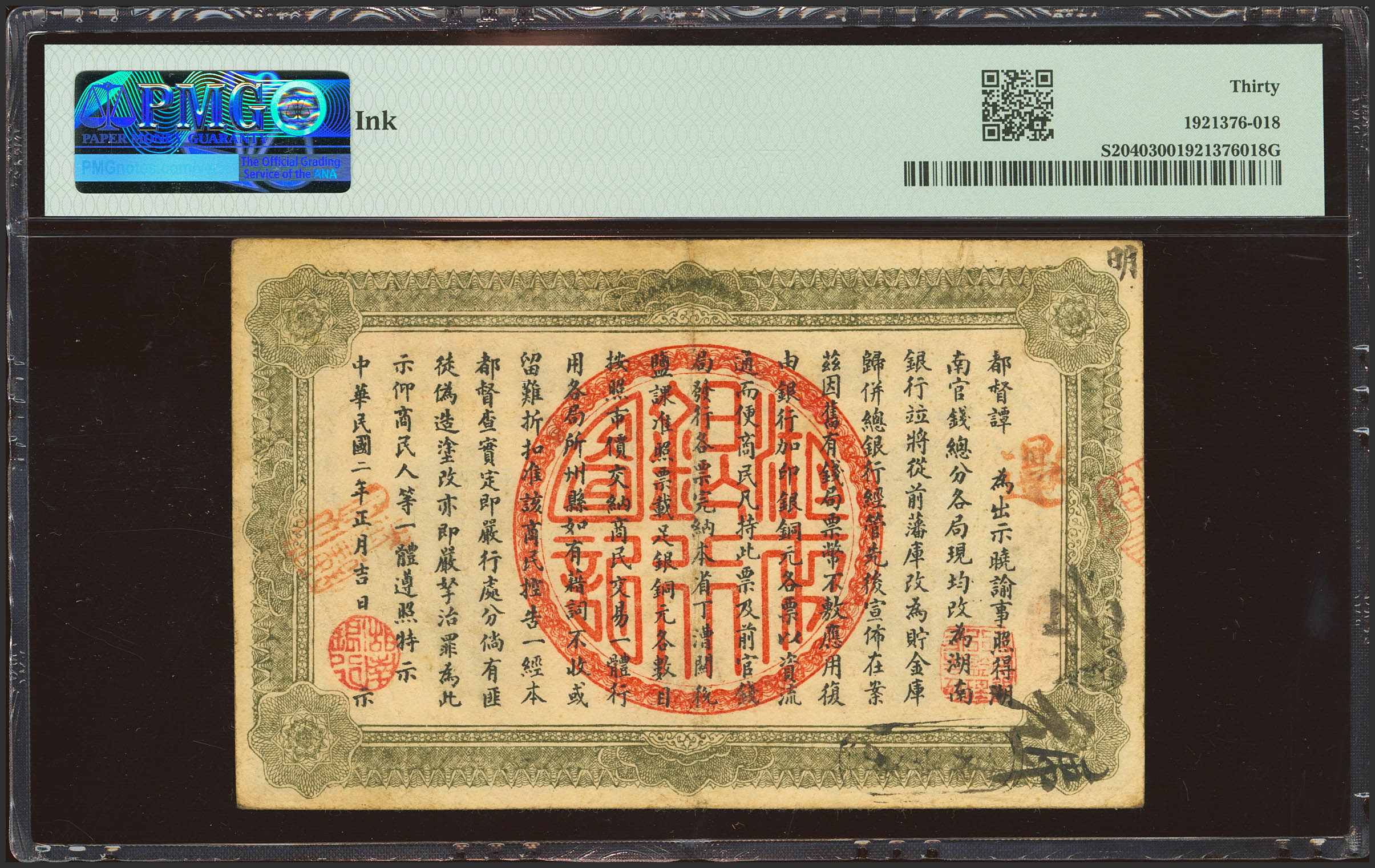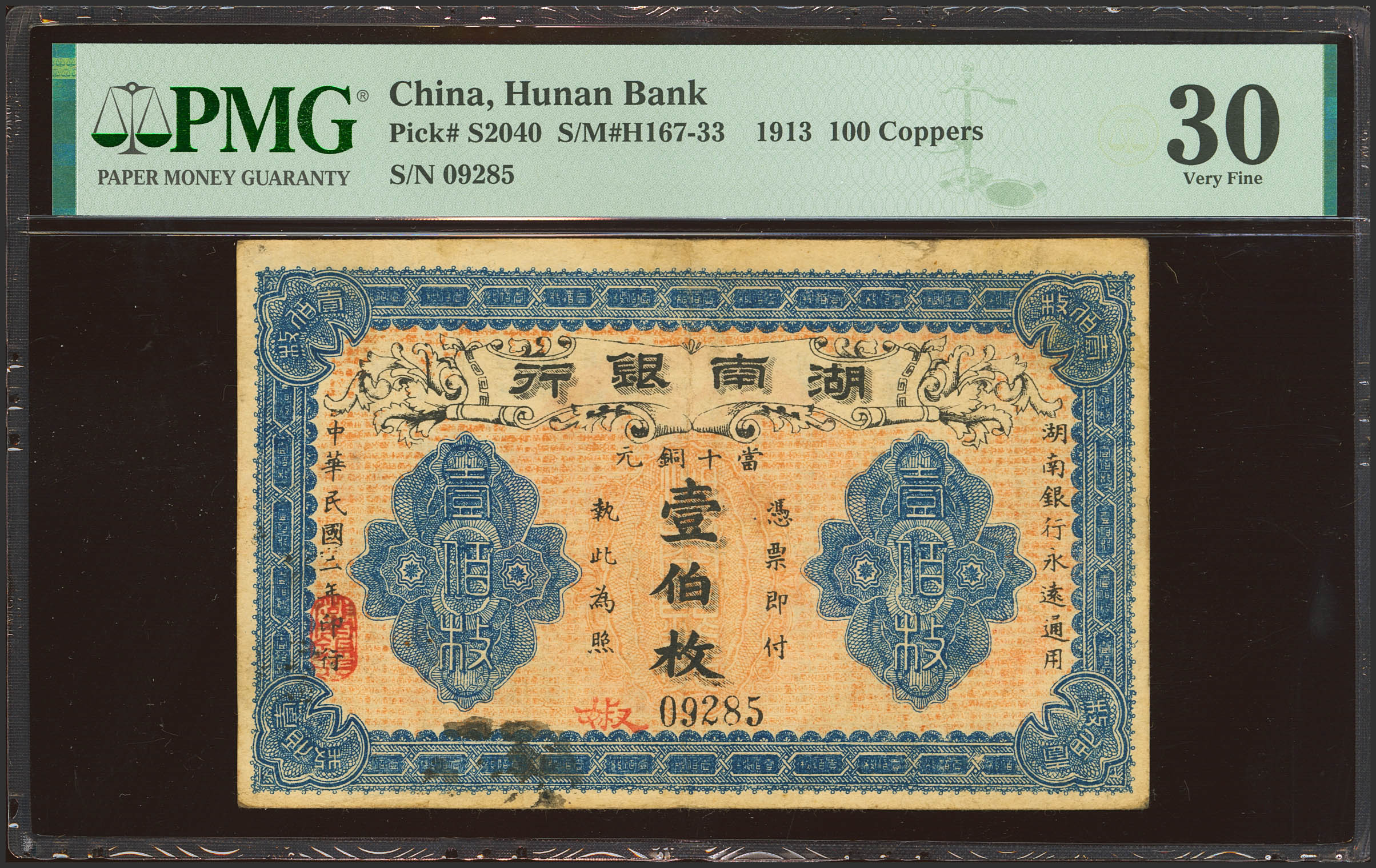 CHINA. 100 Coppers. 1913. Hunan Bank. (Pick: S2040, SM: H167-33). PMG30 (ink).