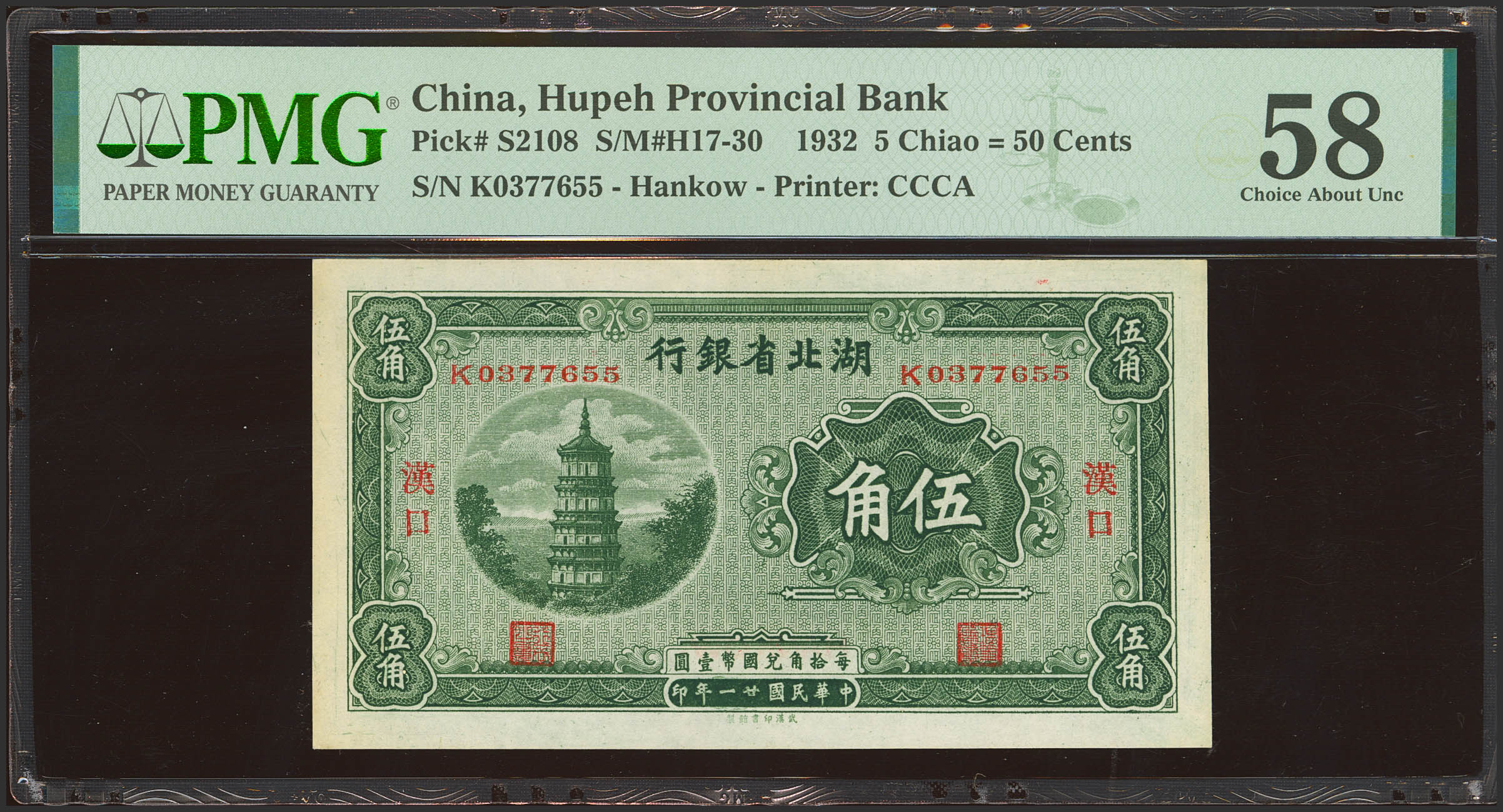 English CHINA. 5 Chiao. 1932. Hupeh Provincial Bank. (Pick: S2108, SM: H17-30). PMG58.