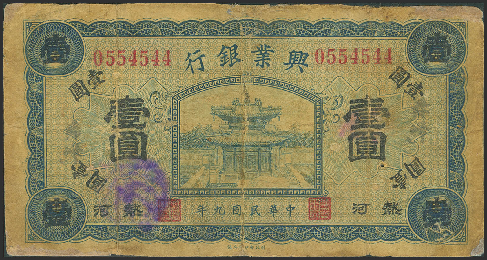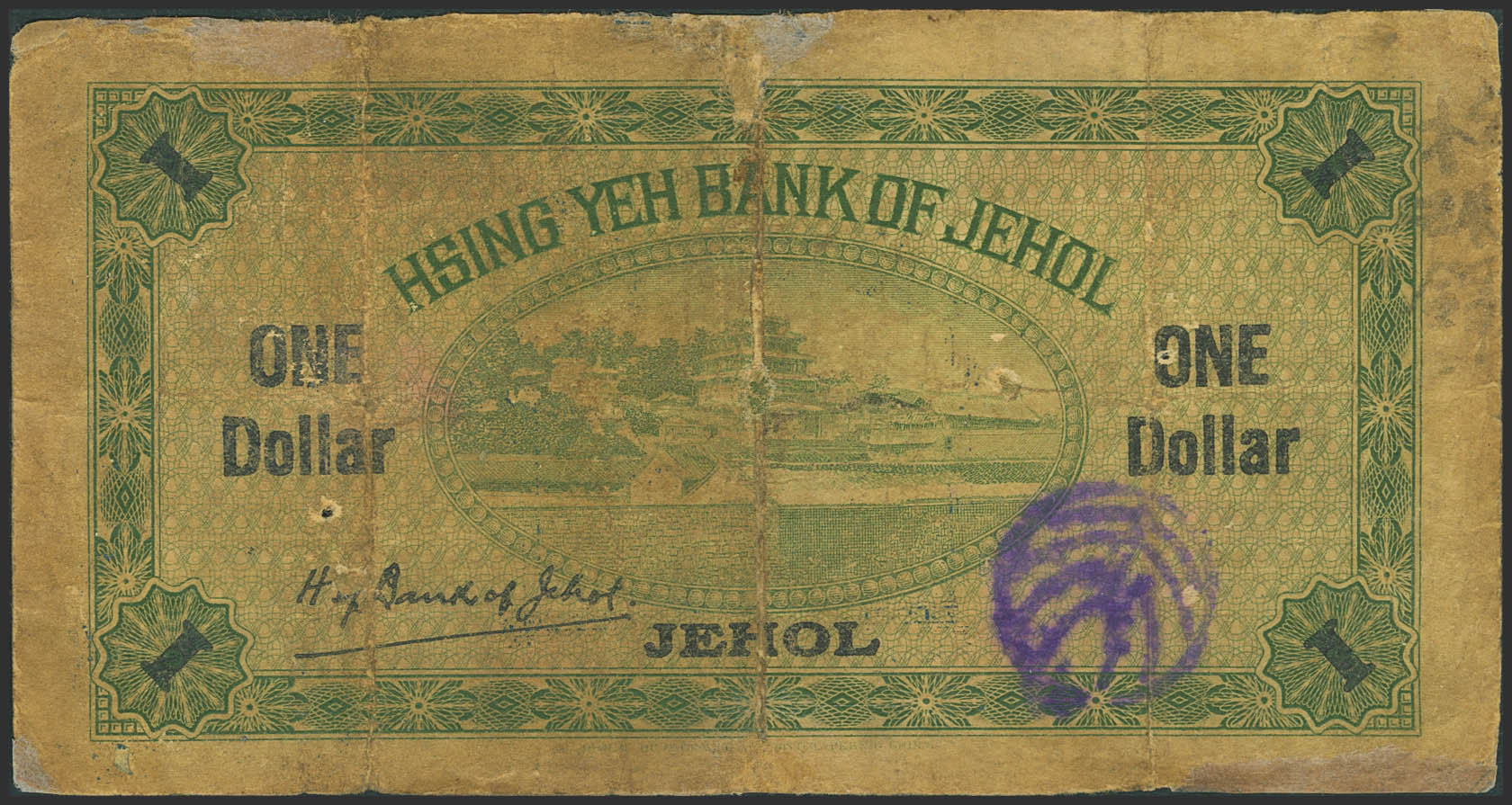 English CHINA. 1 Dollar. 1920. Hsing Yeh Bank of Jehol. We have not been able to determine the place of issuance. (Pick: S2169). Cuts and pinholes. Very Good.