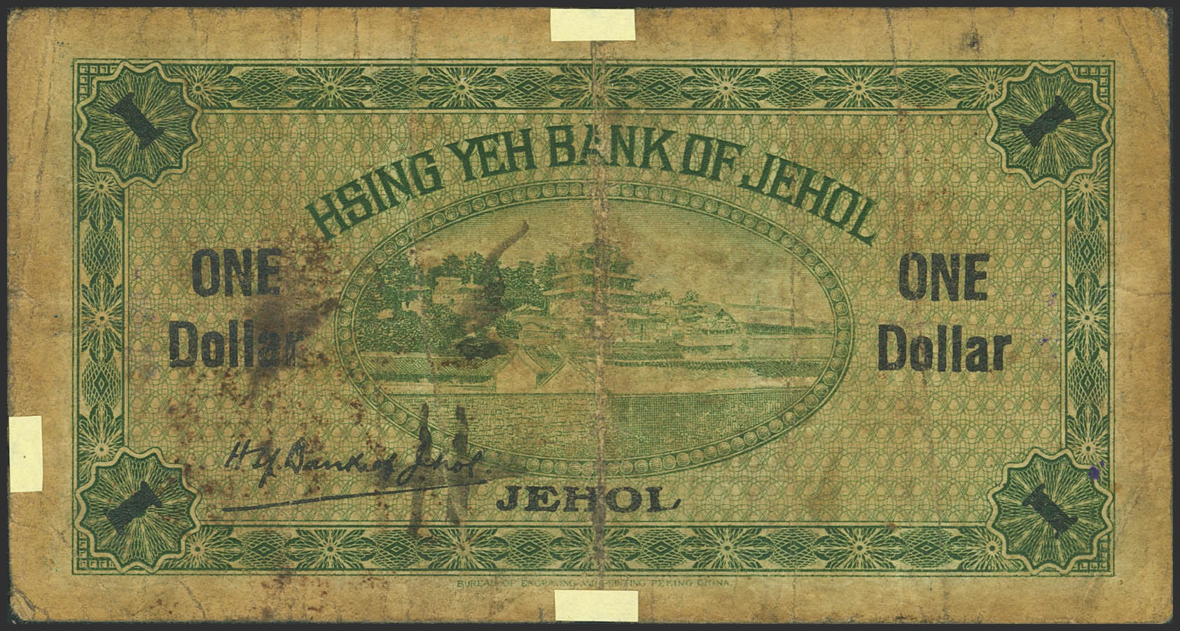 CHINA. 1 Dollar. 1920. Hsing Yeh Bank of Jehol. P'ing Ch'uan. (Pick: S2169m). Removable adhesive paper applied to cuts on back. More than Fine.