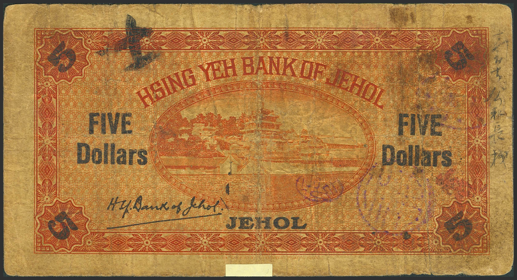 CHINA. 5 Dollars. 1920. Hsing Yeh Bank of Jehol. P'ing Ch'uan. (Pick: S2171). Removable adhesive applied to cuts on back. Fine.