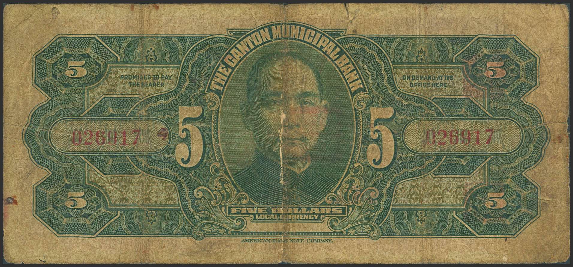 CHINA. 5 Dollars. 1929. Canton Municipal Bank. (Pick: S2257a). Fine.